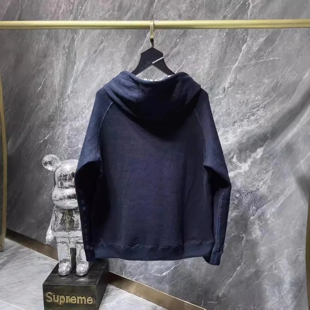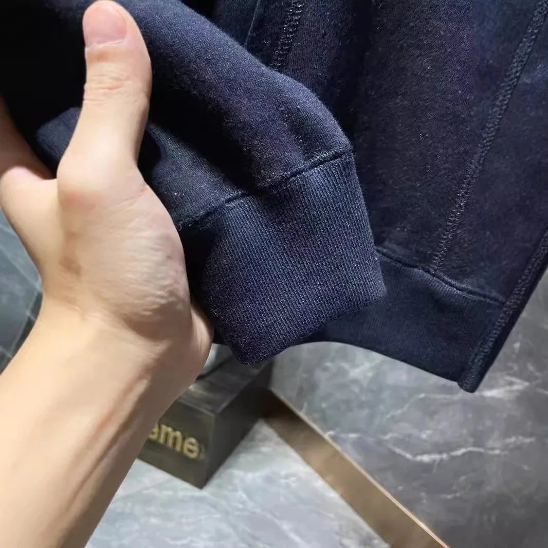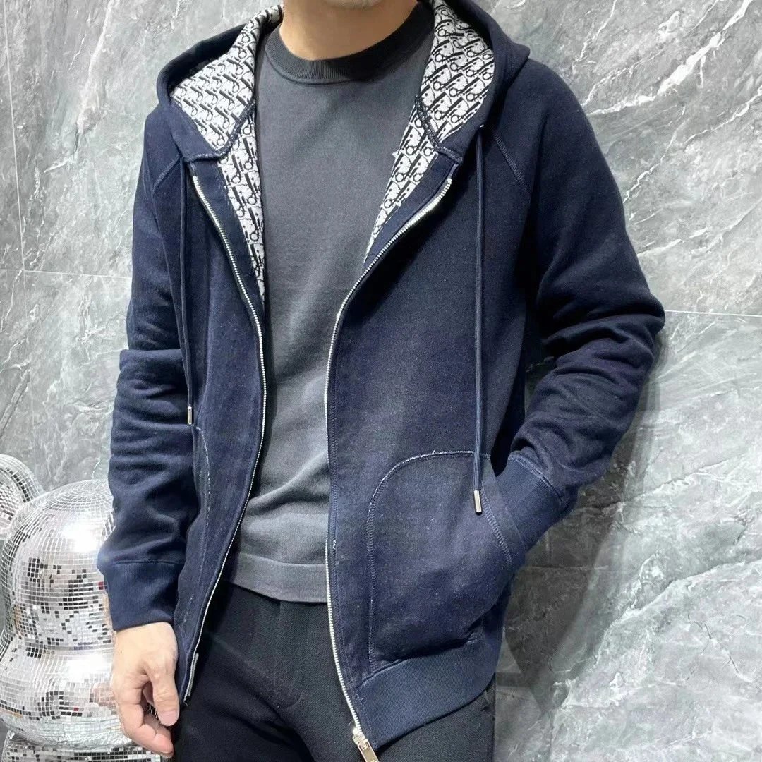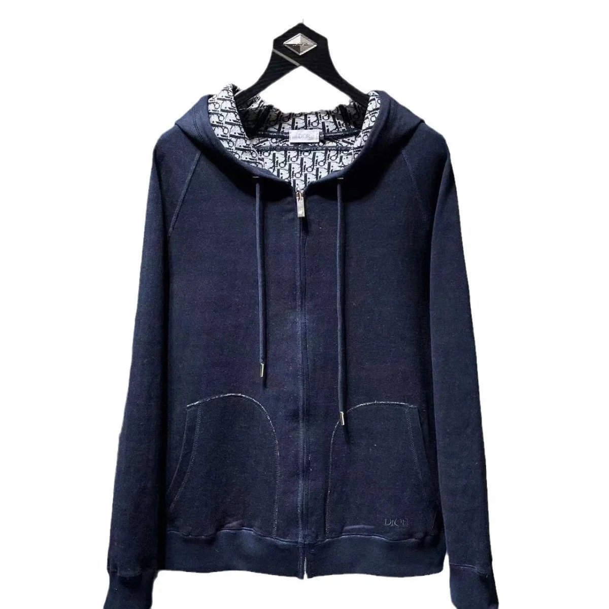 Luxury navy blue Dior hoodie featuring iconic Oblique print lining and front zipper. Perfect for elevated casual wear.
