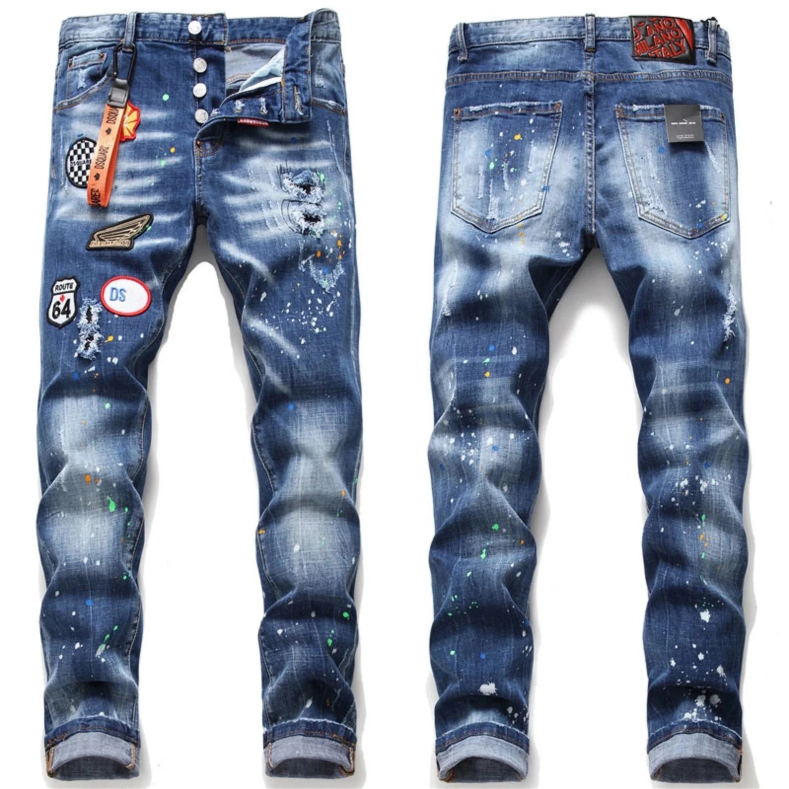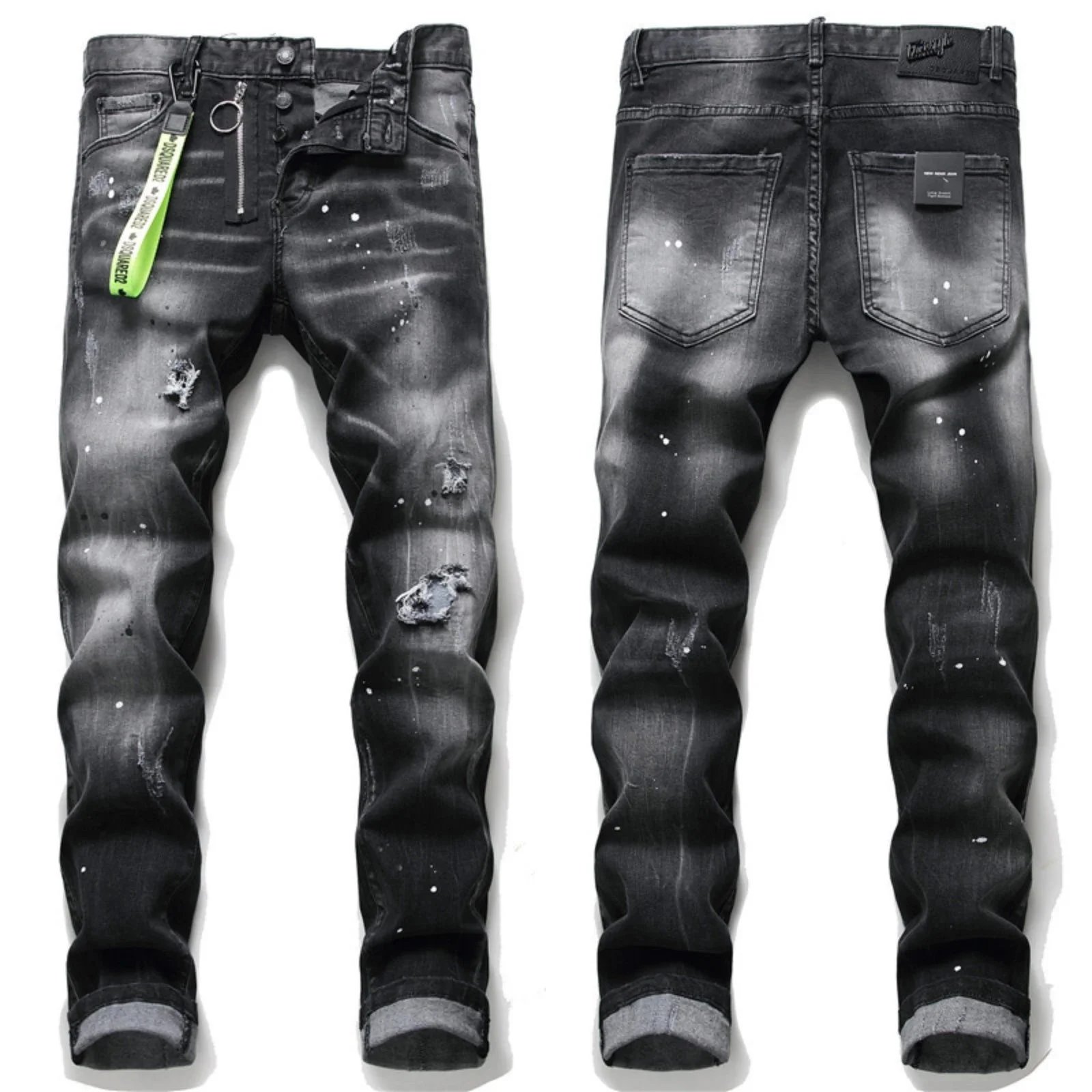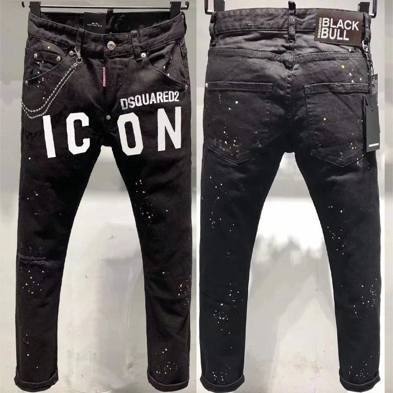 Stylish DSQUARED2 ICON black jeans featuring a bold paint splatter design and front graphic. Perfect for fashion-forward individuals seeking high-end denim with edgy details.