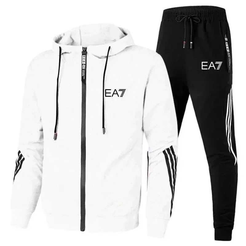 Stylish EA7 grey zip-up hoodie and matching joggers featuring bold stripes and iconic branding for comfortable, sporty everyday wear.