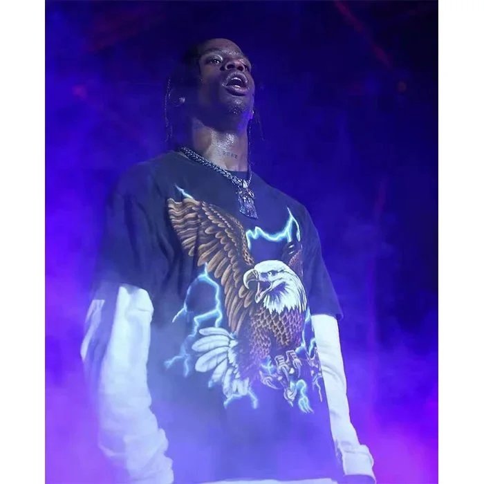 Black t-shirt featuring a striking eagle with outstretched wings surrounded by vivid lightning bolts. Ideal for casual wear with a powerful, mythical graphic design.