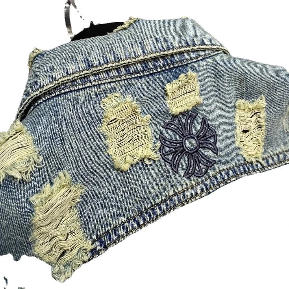 Stylish ERMINDD Japan denim jacket featuring a vintage wash, floral embroidery, and intentional distressing for a bold streetwear look.