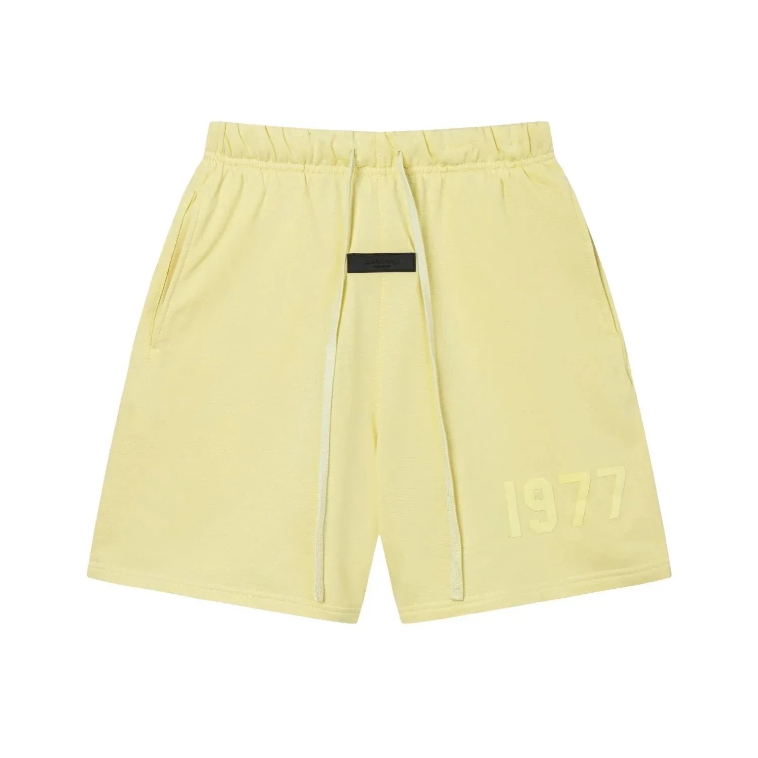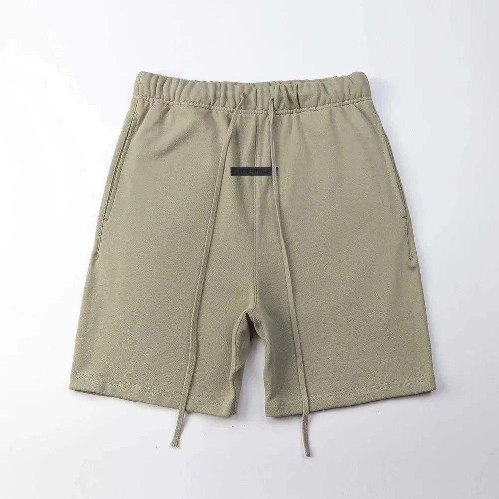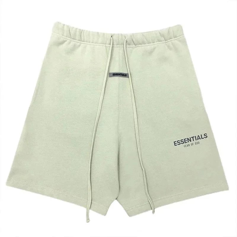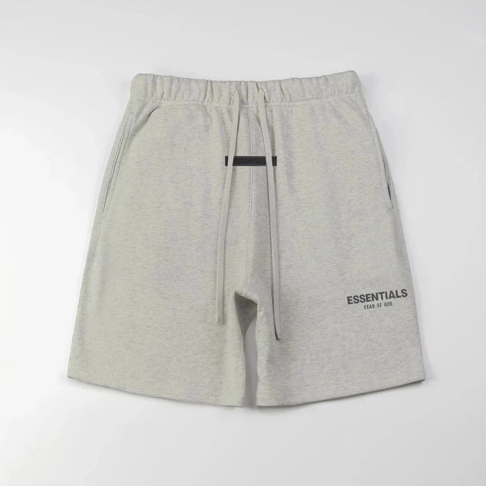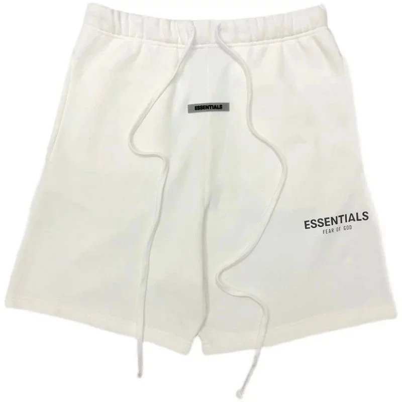 Cream-colored Fear of God Essentials drawstring shorts featuring a minimalist design with brand logo patch and 'ESSENTIALS FEAR OF GOD' text on the leg. Perfect for casual wear or lounging.
