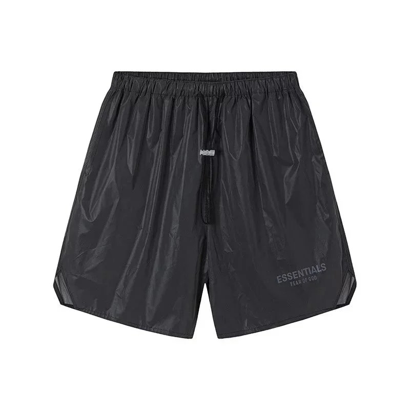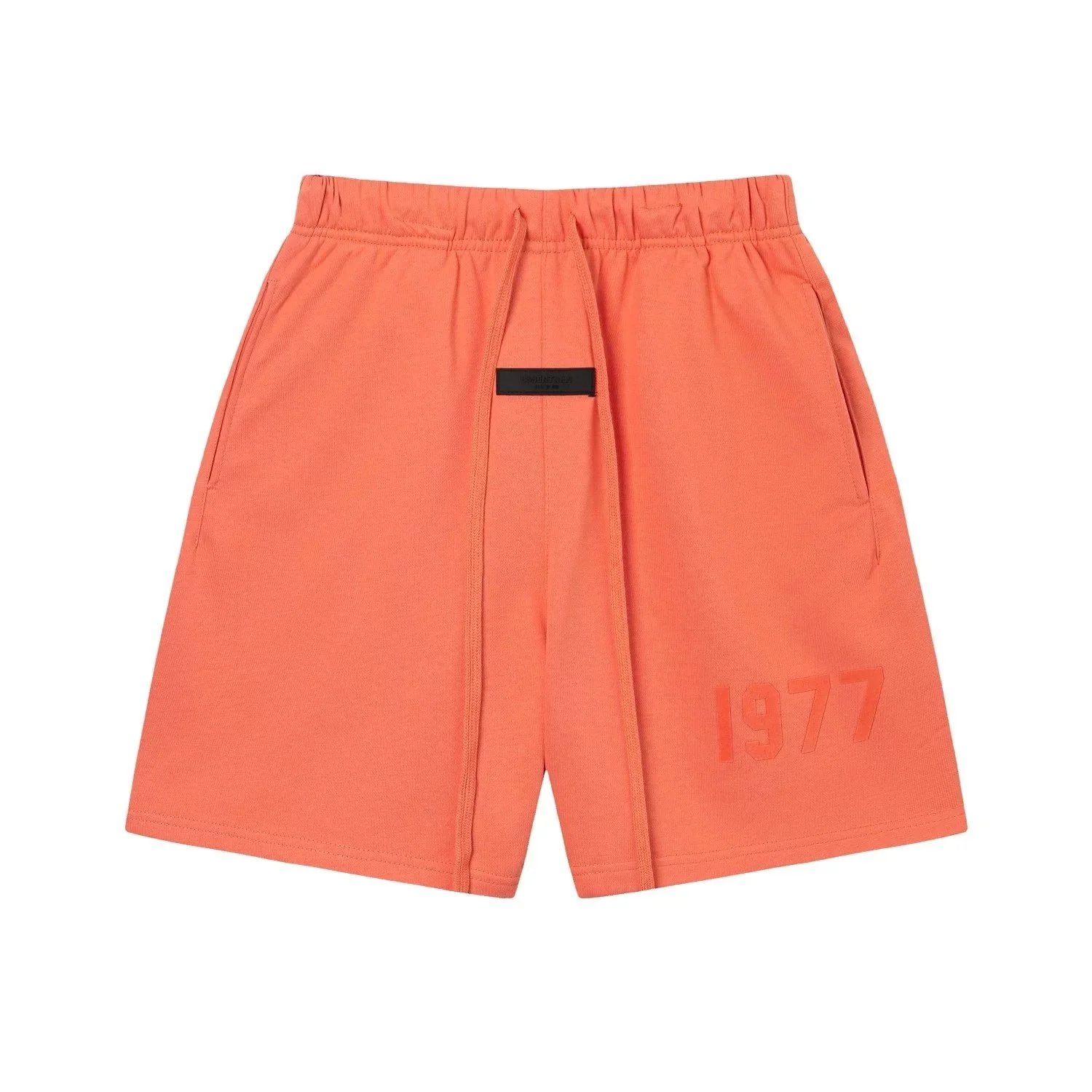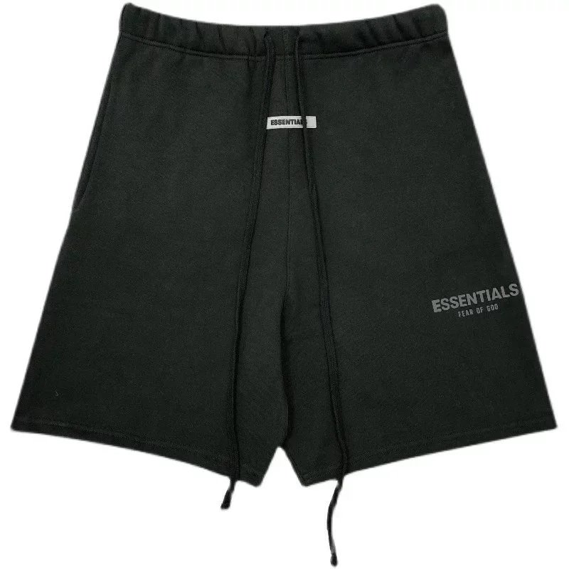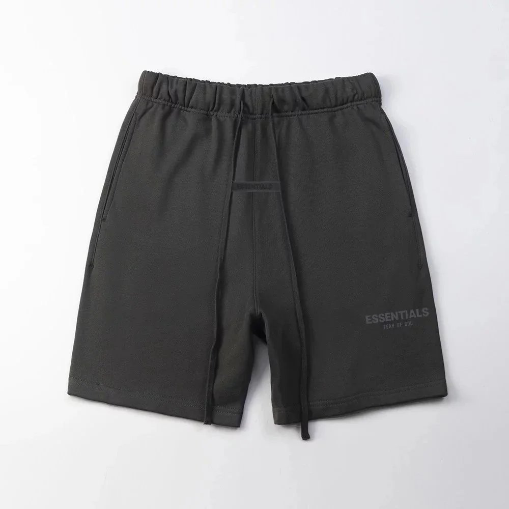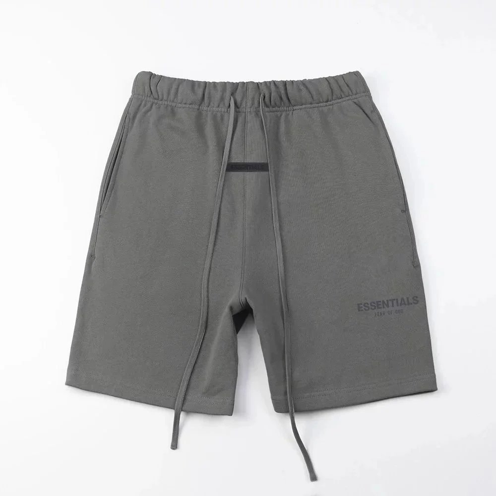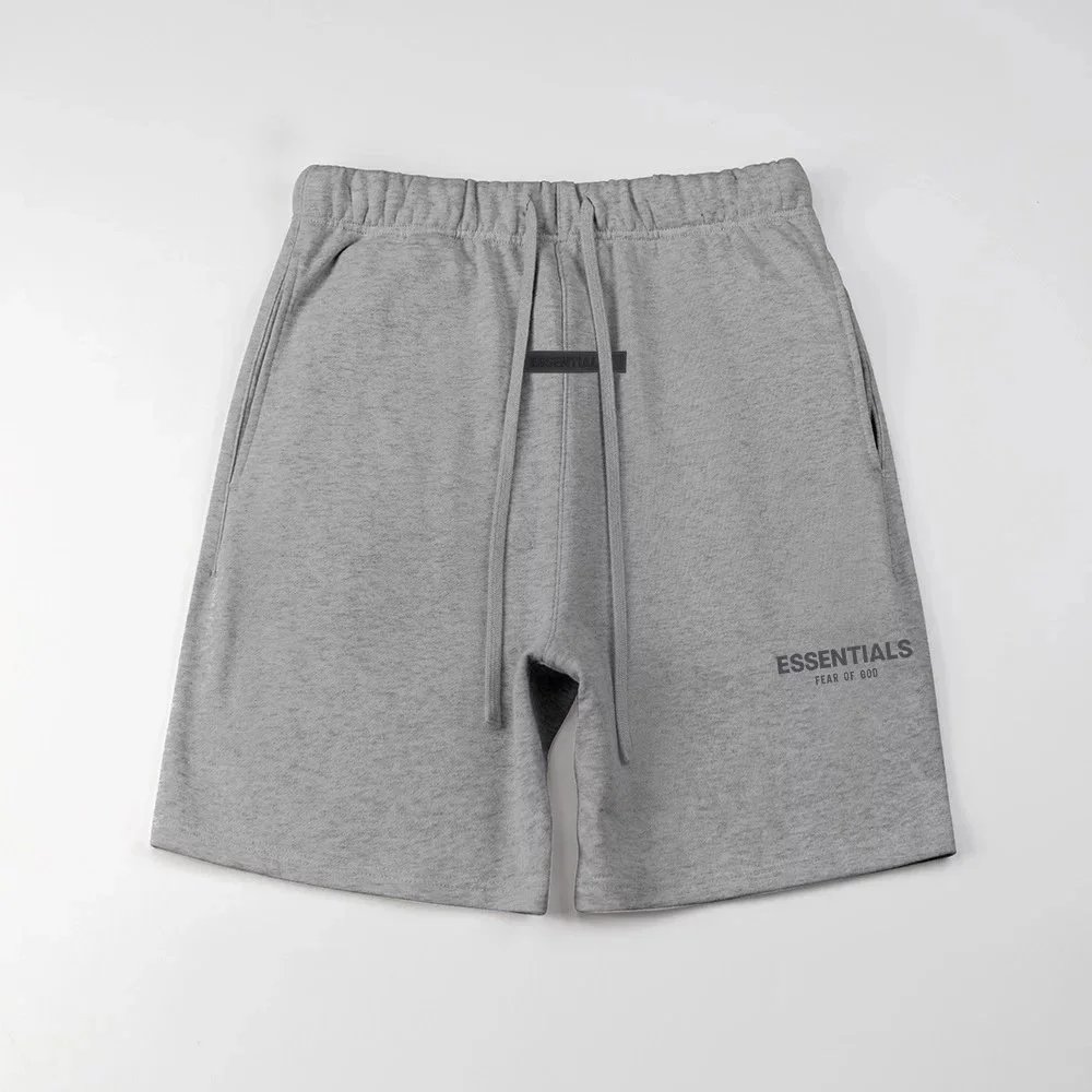 Cream-colored Fear of God Essentials drawstring shorts featuring a minimalist design with brand logo patch and 'ESSENTIALS FEAR OF GOD' text on the leg. Perfect for casual wear or lounging.
