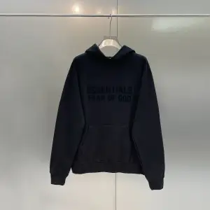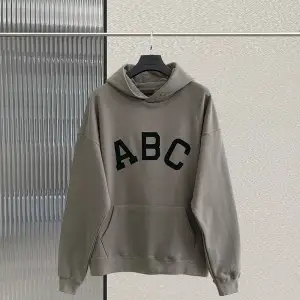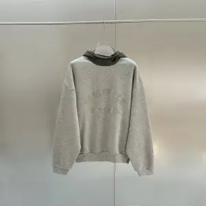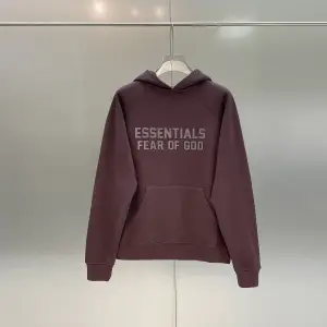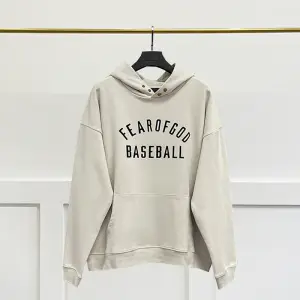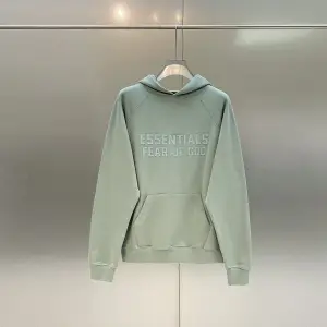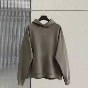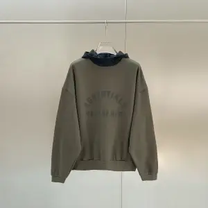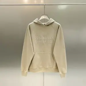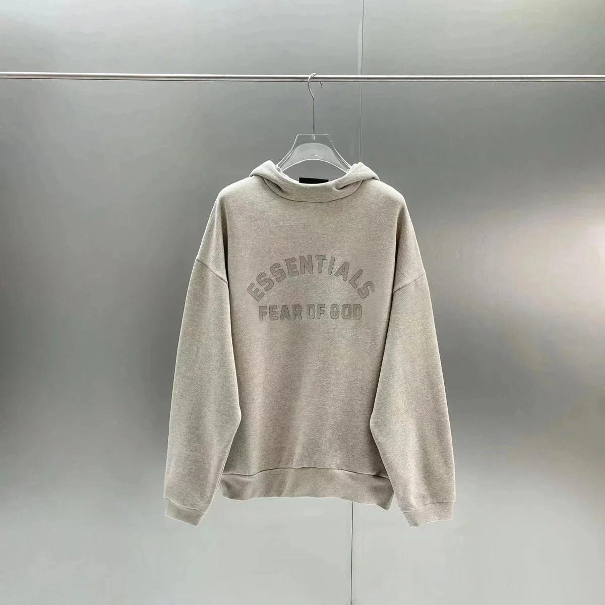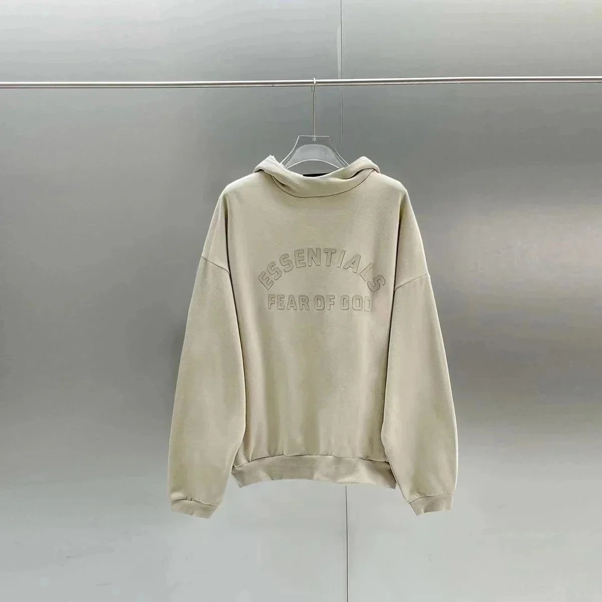 Beige Fear of God Essentials hoodie featuring an embossed arched logo on the back. Designed for relaxed comfort with a classic oversized silhouette.