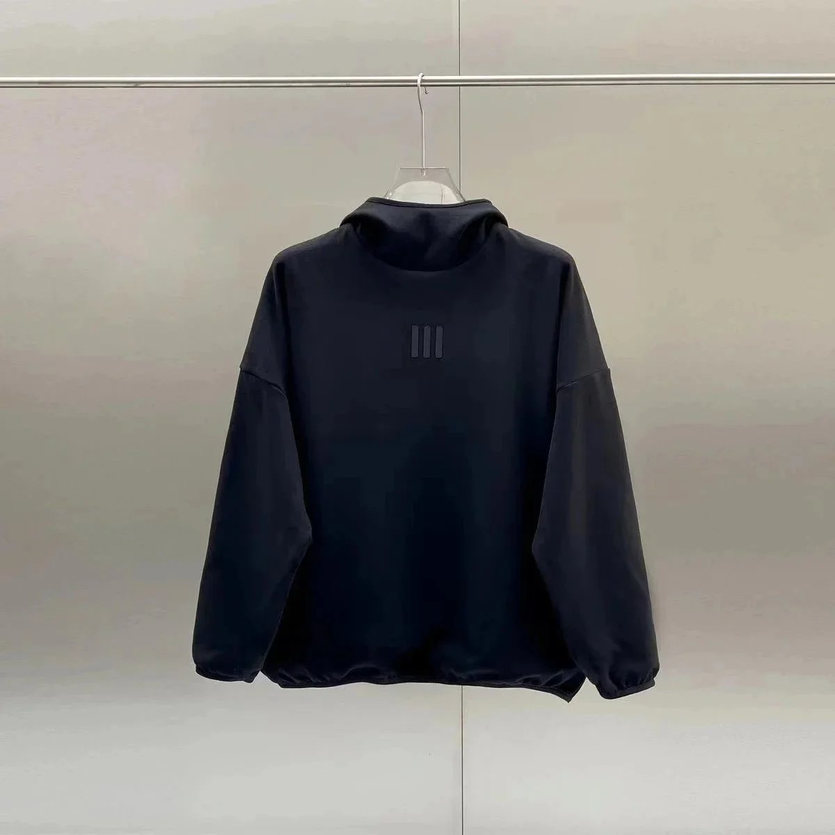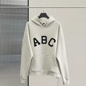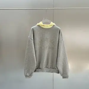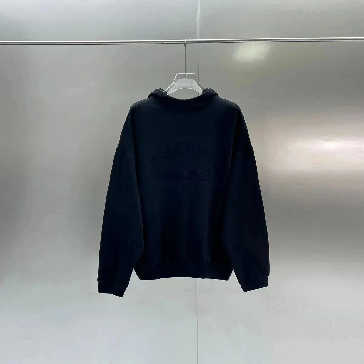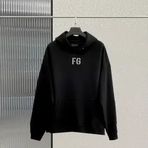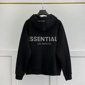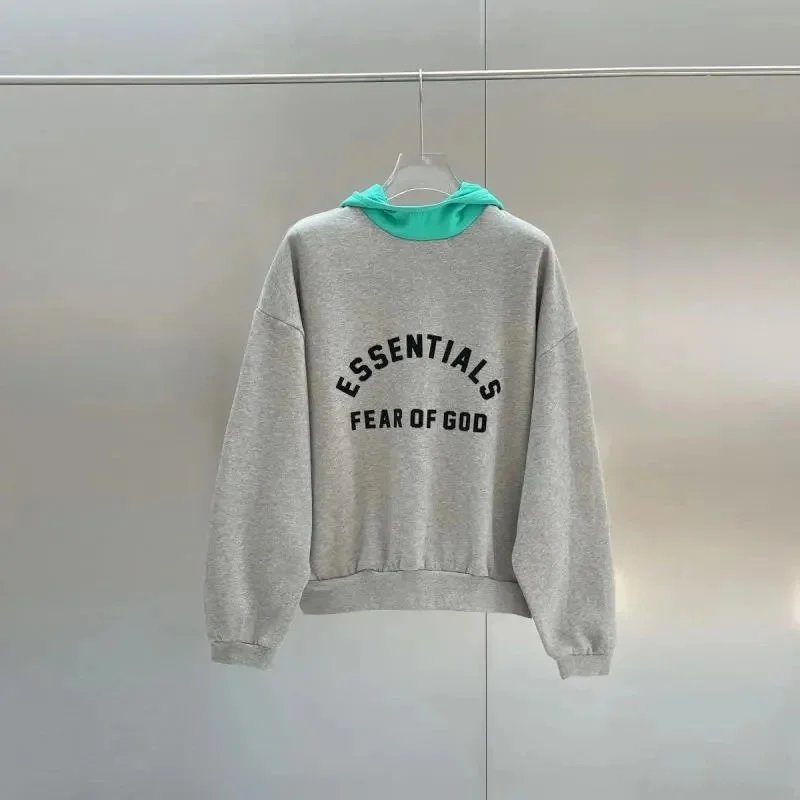 Beige Fear of God Essentials hoodie featuring an embossed arched logo on the back. Designed for relaxed comfort with a classic oversized silhouette.