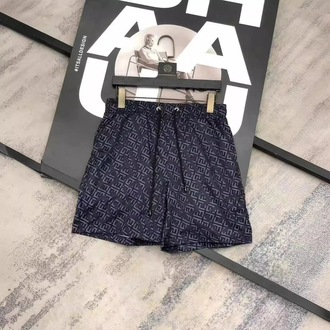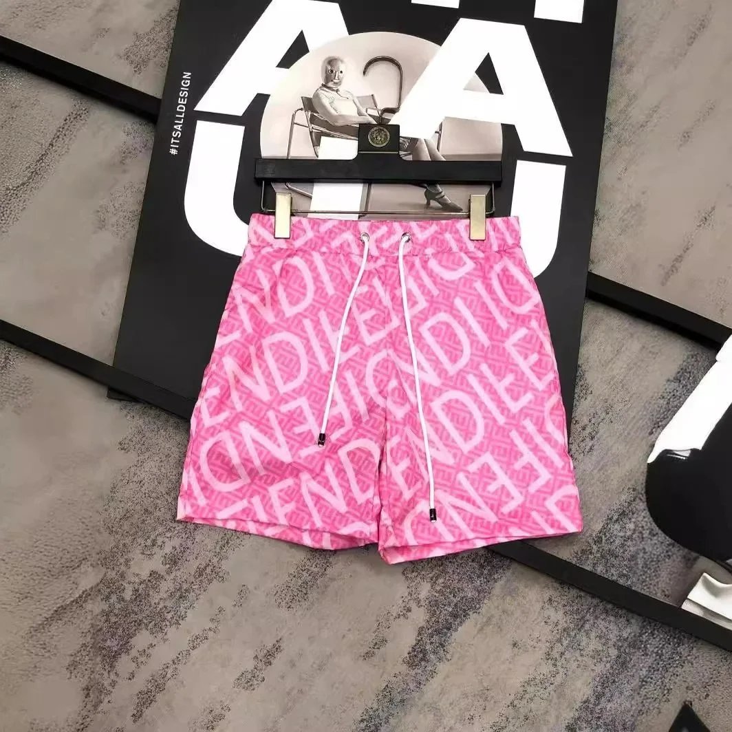 Stylish Fendi logo print swim shorts featuring bold branding and geometric patterns. Available in vibrant pink, navy, white, and beige for a luxurious beach look.