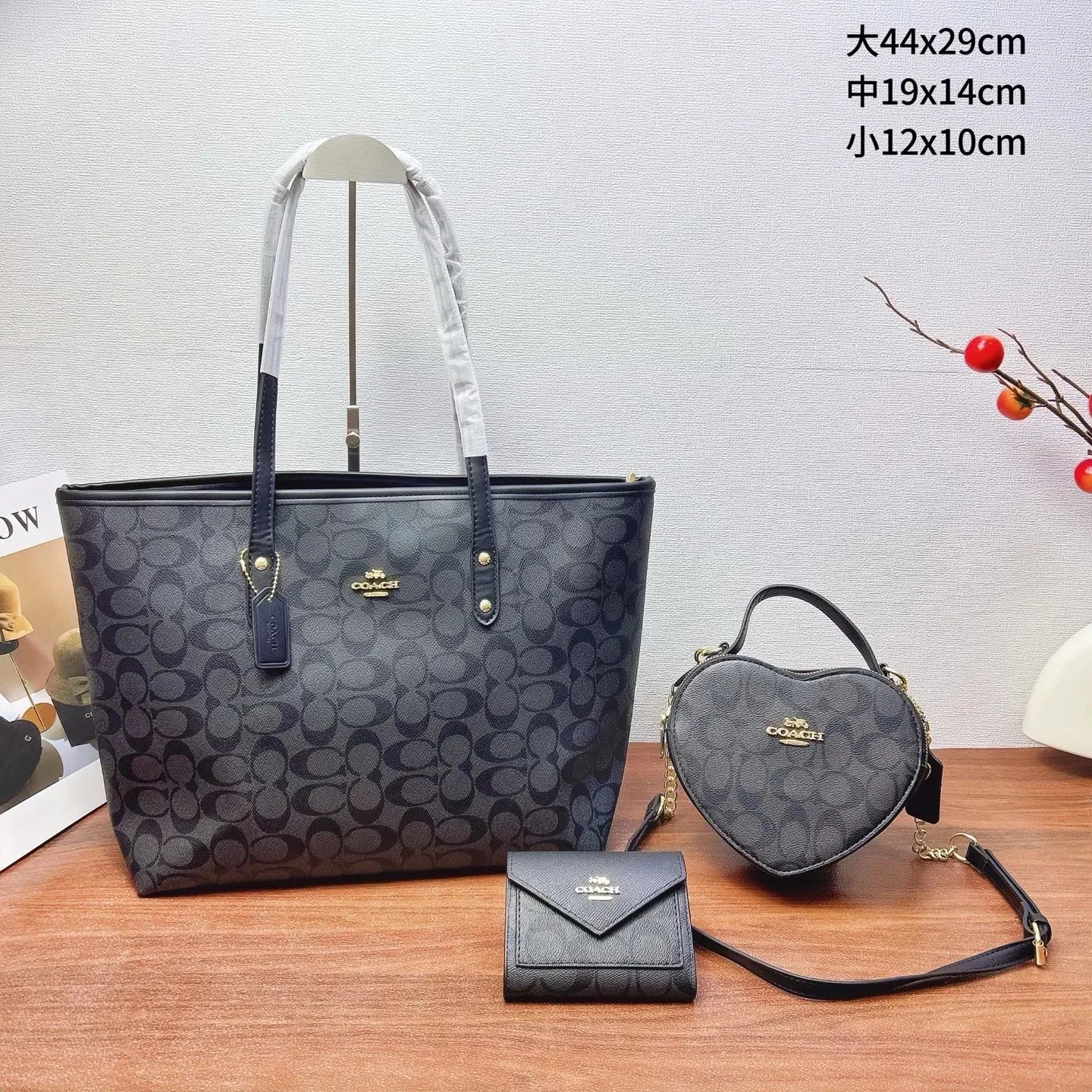 Elegant Fendi monogram handbag set featuring a structured tote, matching crossbody bag, and compact wallet. All pieces showcase the iconic FF logo in beige and brown tones for timeless luxury.