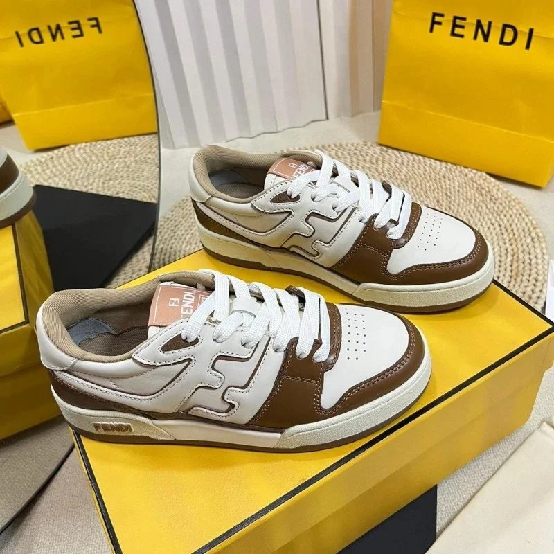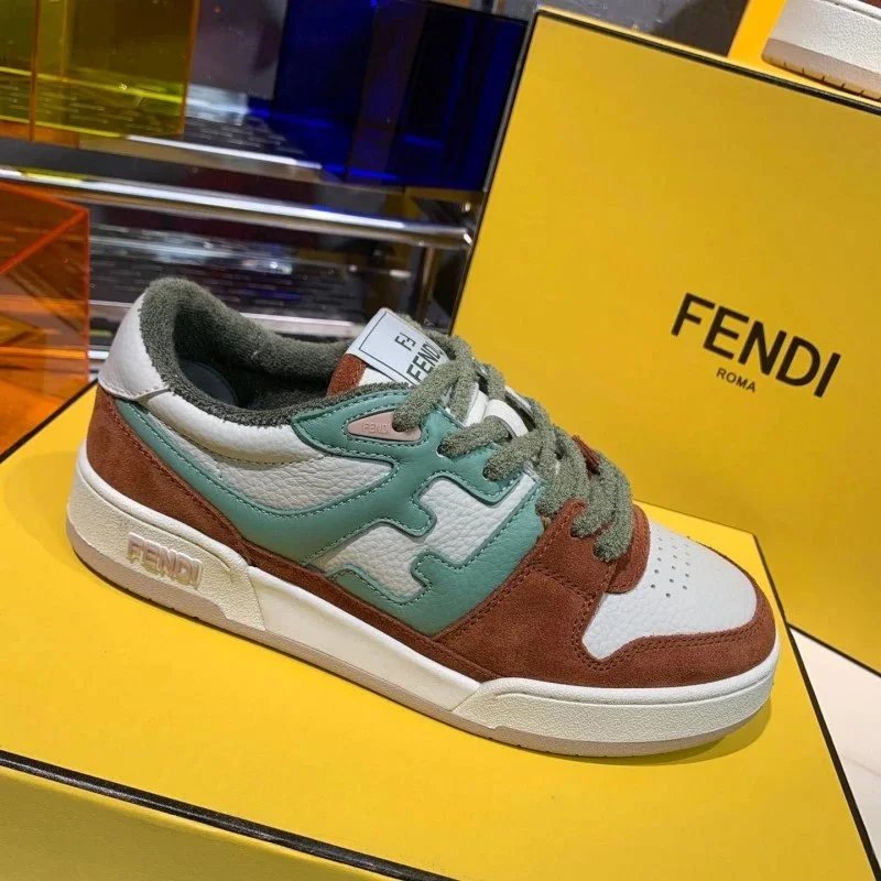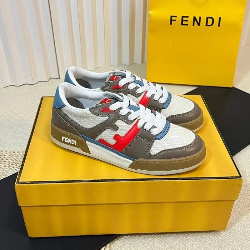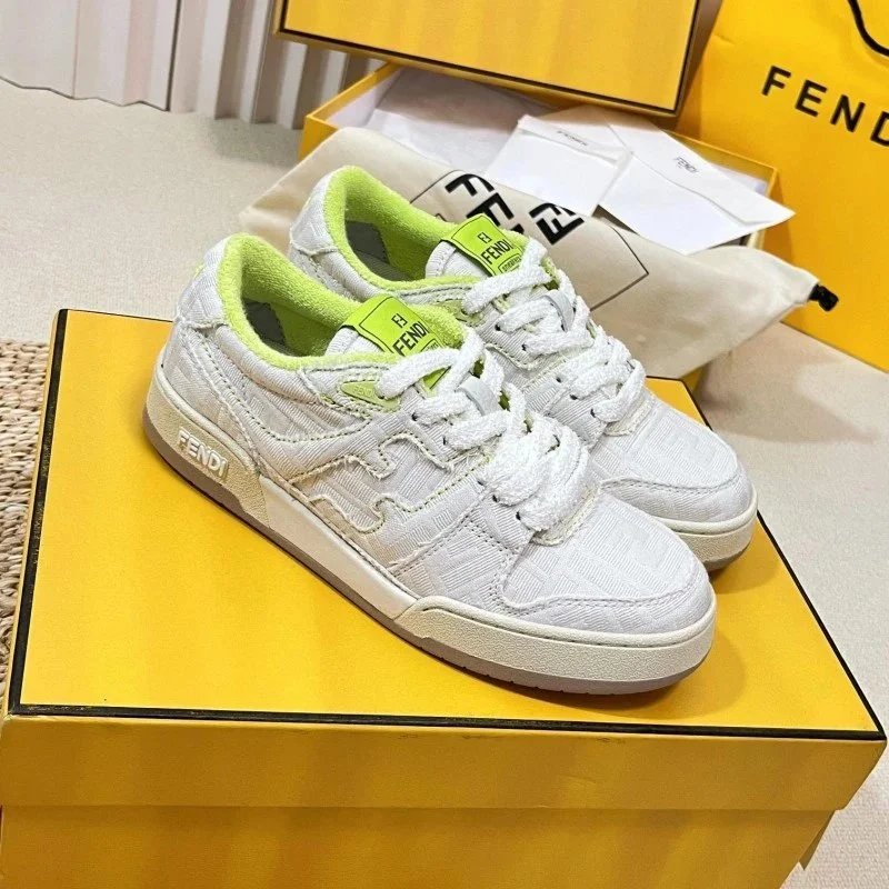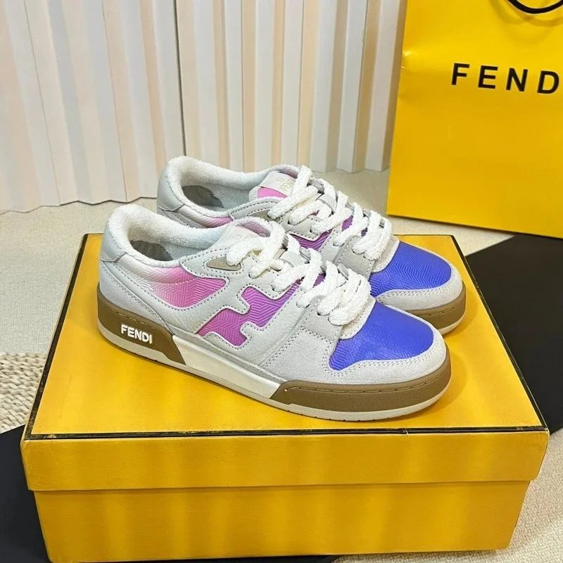 Elevate your streetwear with these Fendi low-top sneakers featuring bold yellow and lavender panels, signature FF logo, and burgundy laces. Perfect for luxury fashion lovers.
