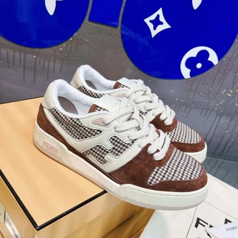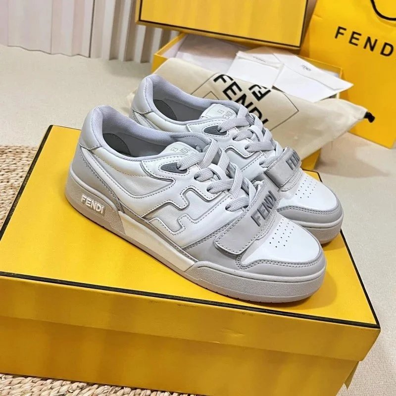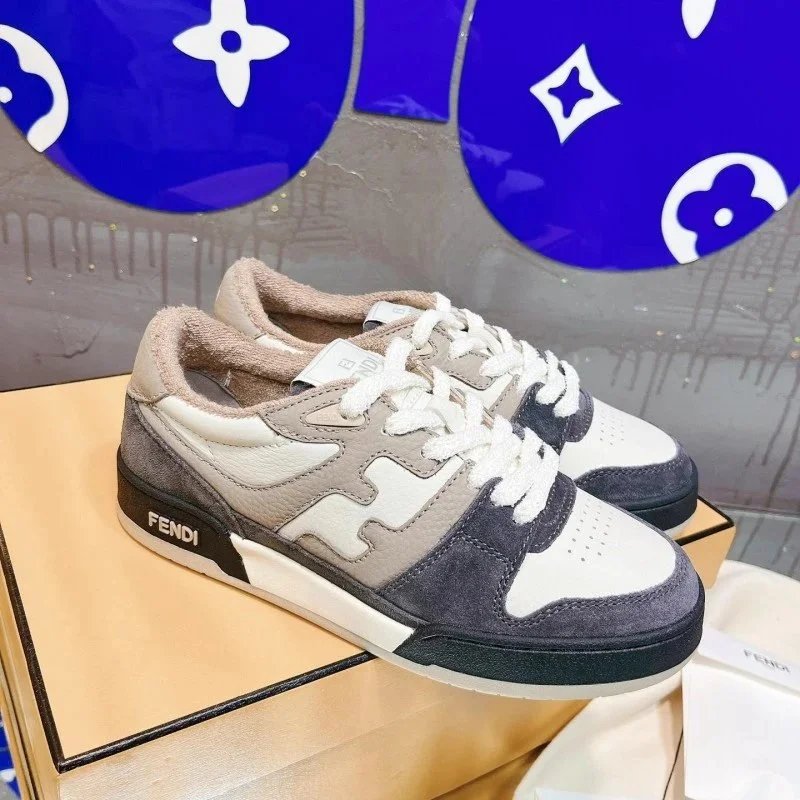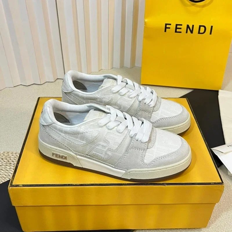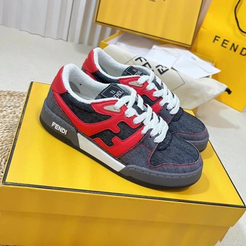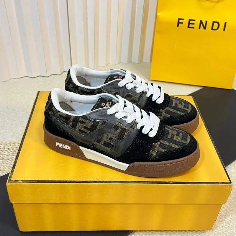 Elevate your streetwear with these Fendi low-top sneakers featuring bold yellow and lavender panels, signature FF logo, and burgundy laces. Perfect for luxury fashion lovers.