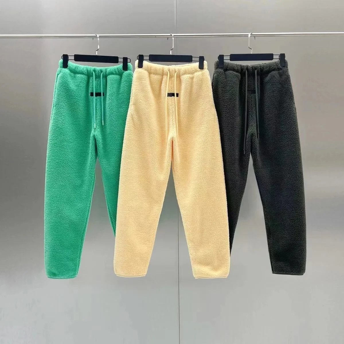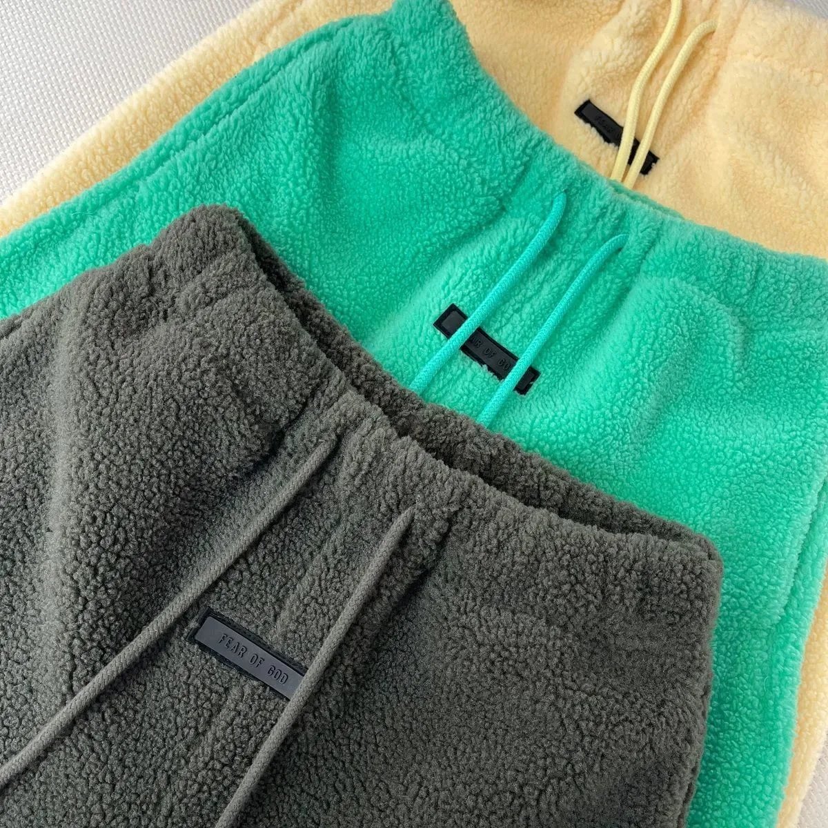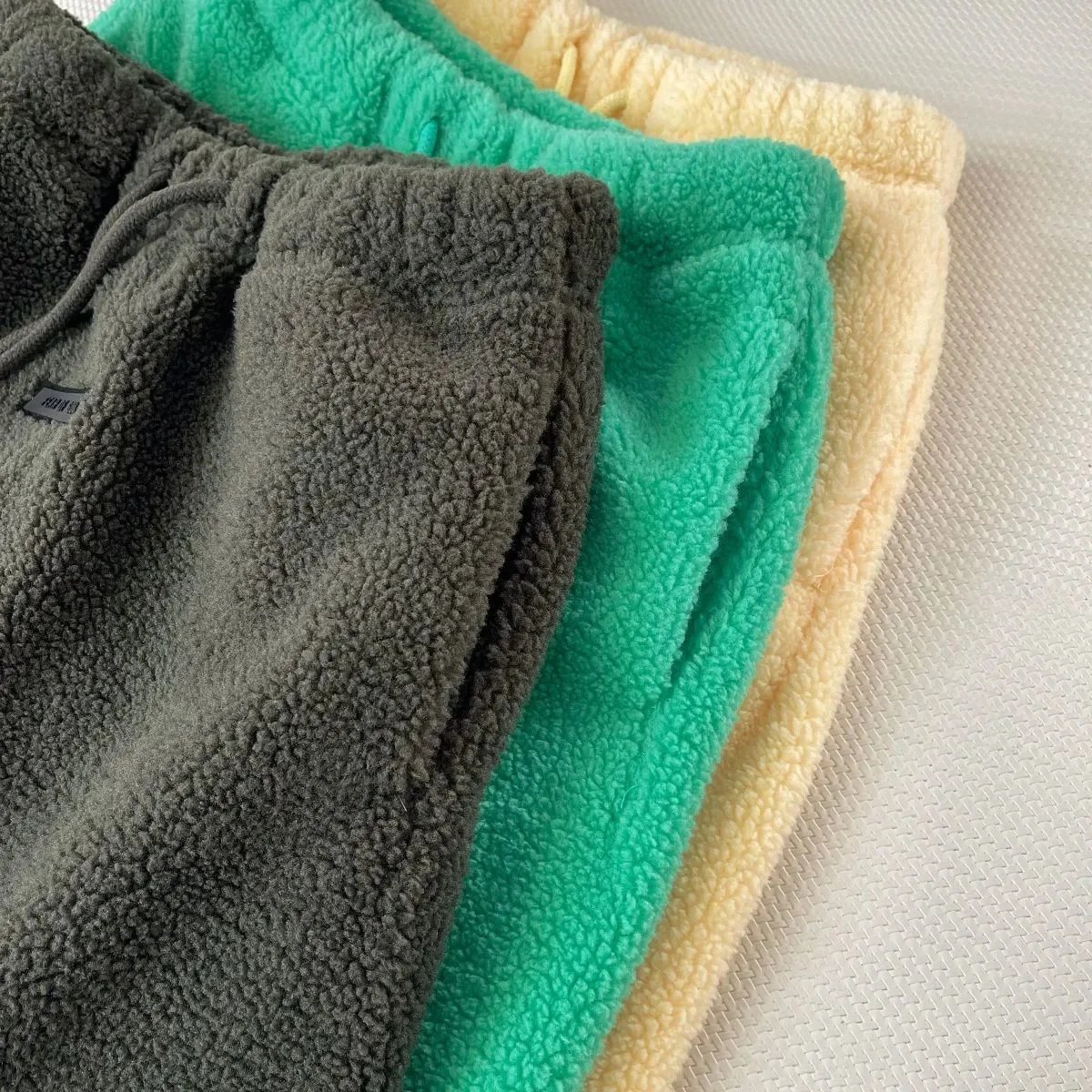 Cozy fleece sweatshirt and matching jogger pants sets in vibrant green, neutral gray, and warm yellow. Designed for comfort with a relaxed fit and ribbed waistband.