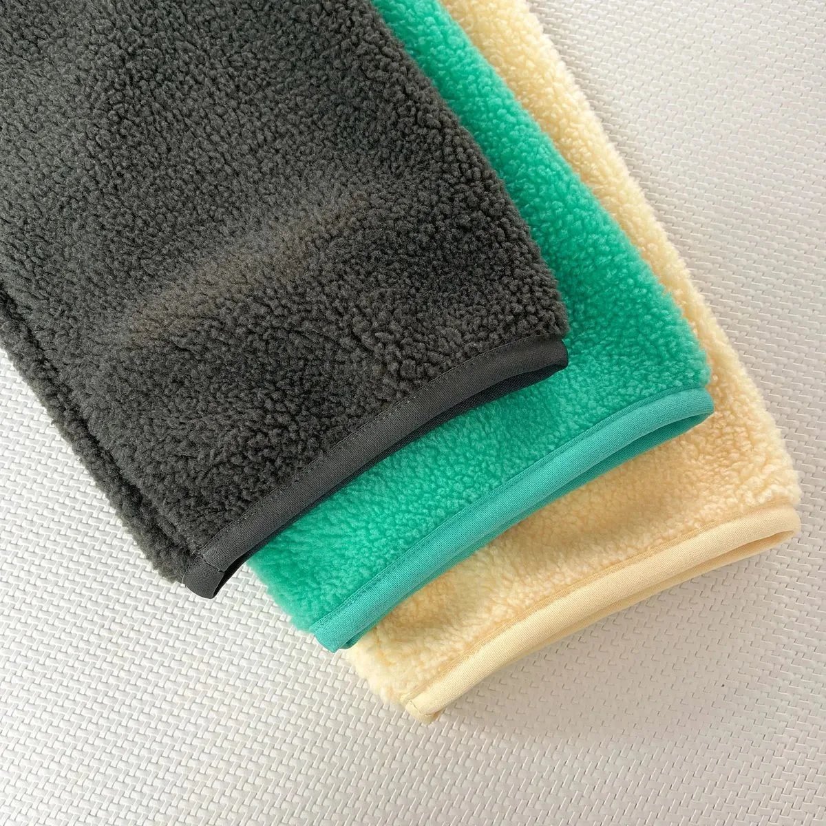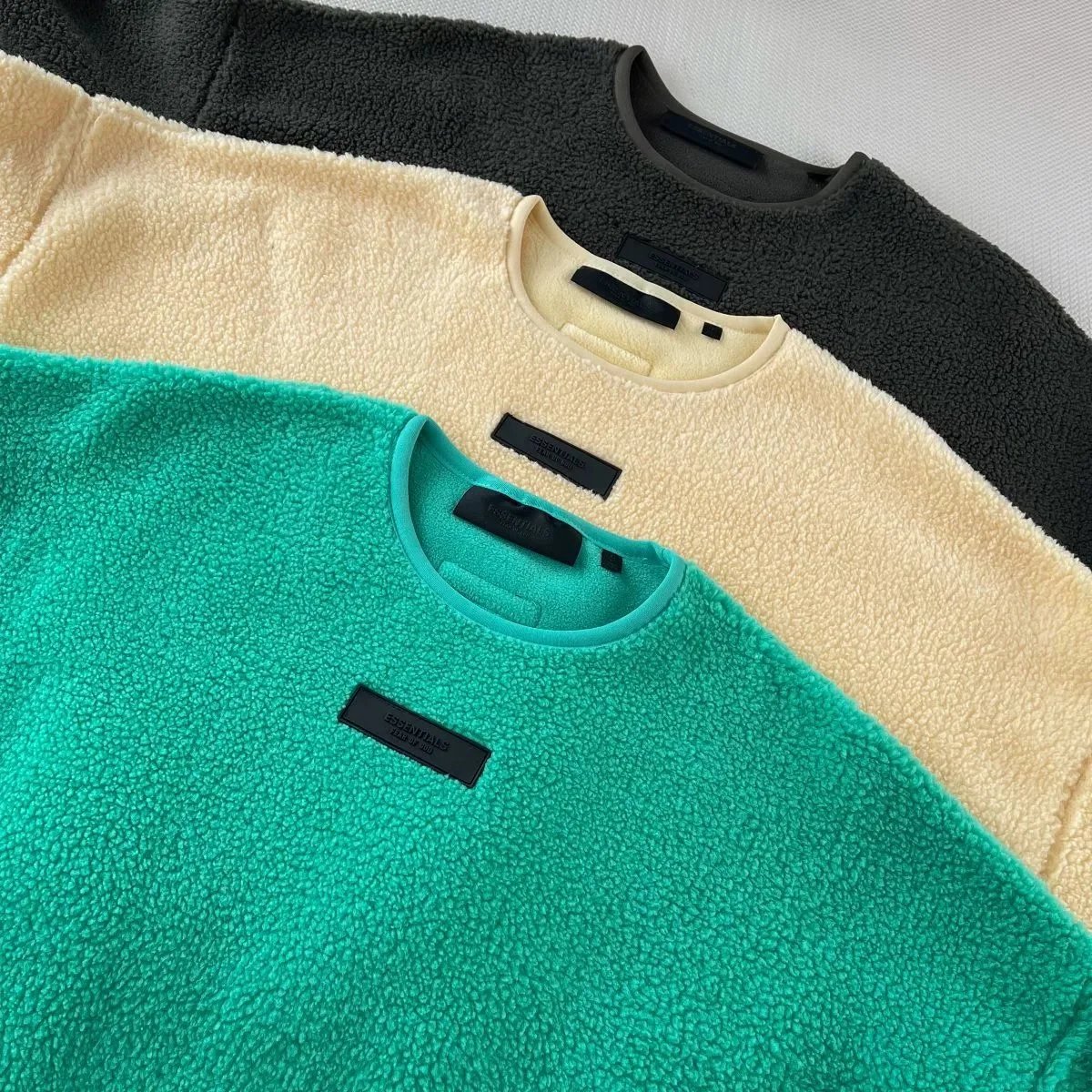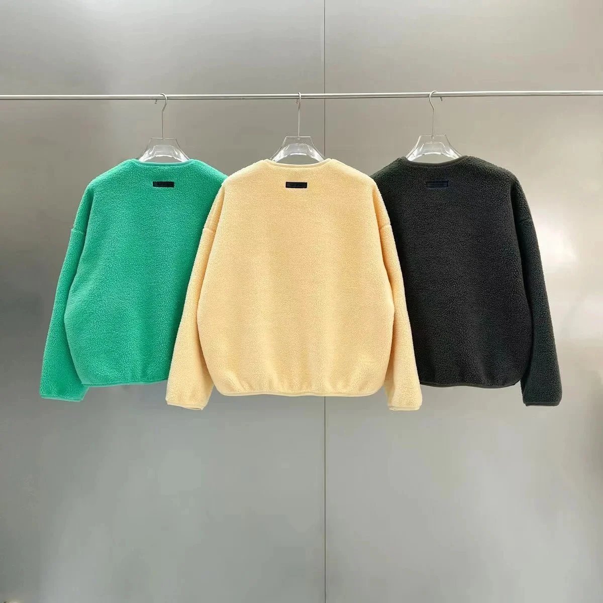 Cozy fleece sweatshirt and matching jogger pants sets in vibrant green, neutral gray, and warm yellow. Designed for comfort with a relaxed fit and ribbed waistband.