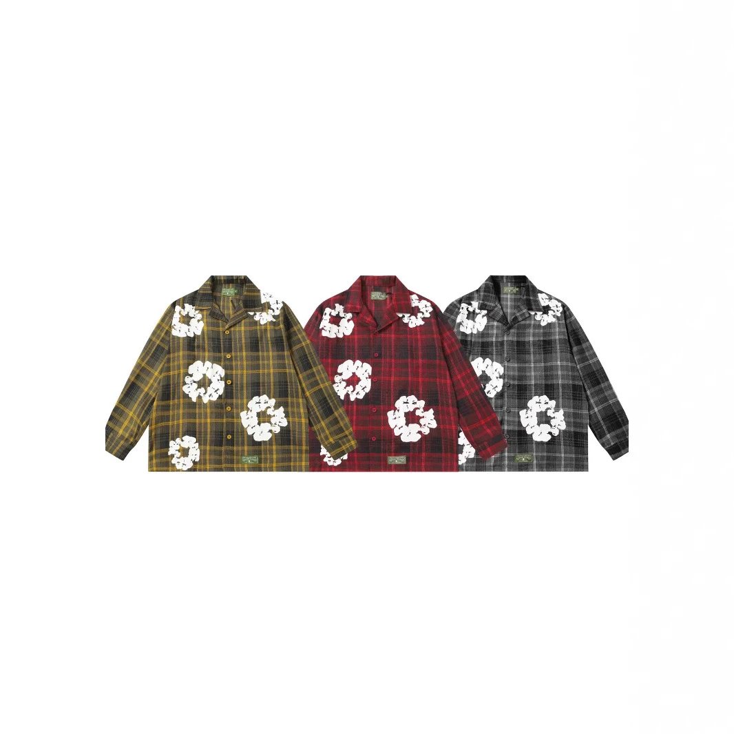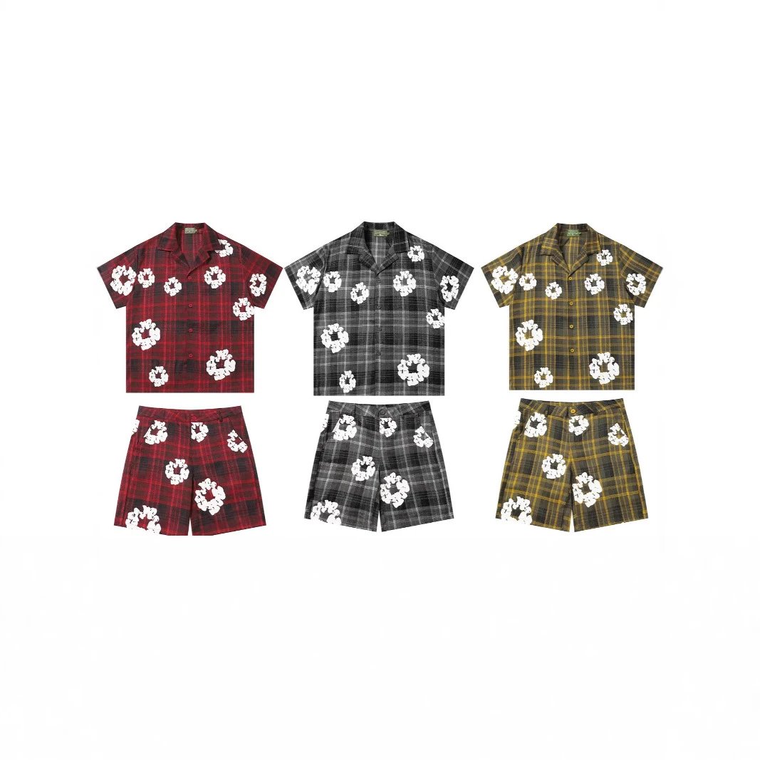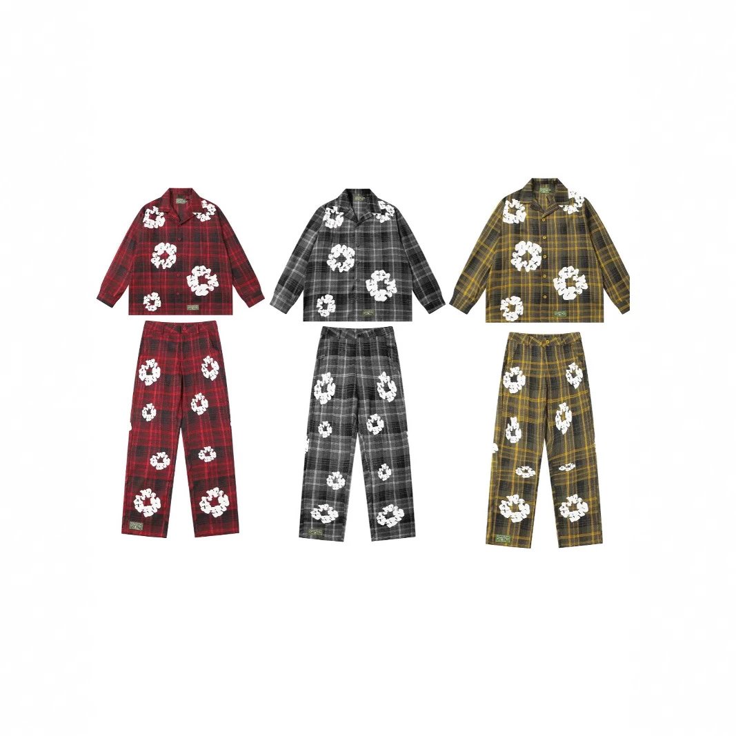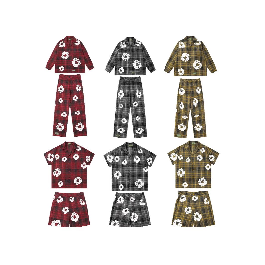 Stylish plaid pajama sets featuring white floral patterns in red, gray, and yellow. Includes long-sleeve tops with pants and short-sleeve tops with shorts for versatile lounging.