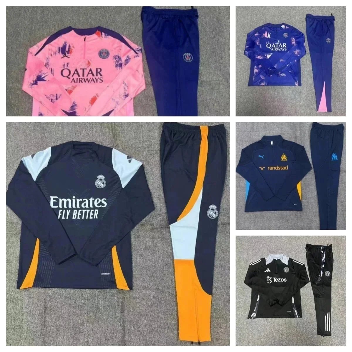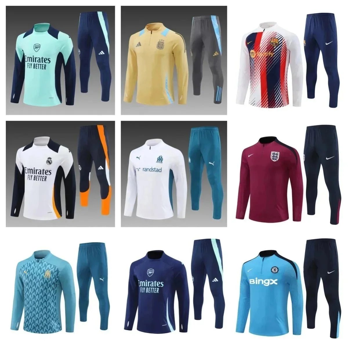 Complete football training sets featuring official team logos and sponsor branding like Emirates, Tezos, and Spotify. Each set includes a long-sleeve top and matching pants in various colorways for professional-style practice.