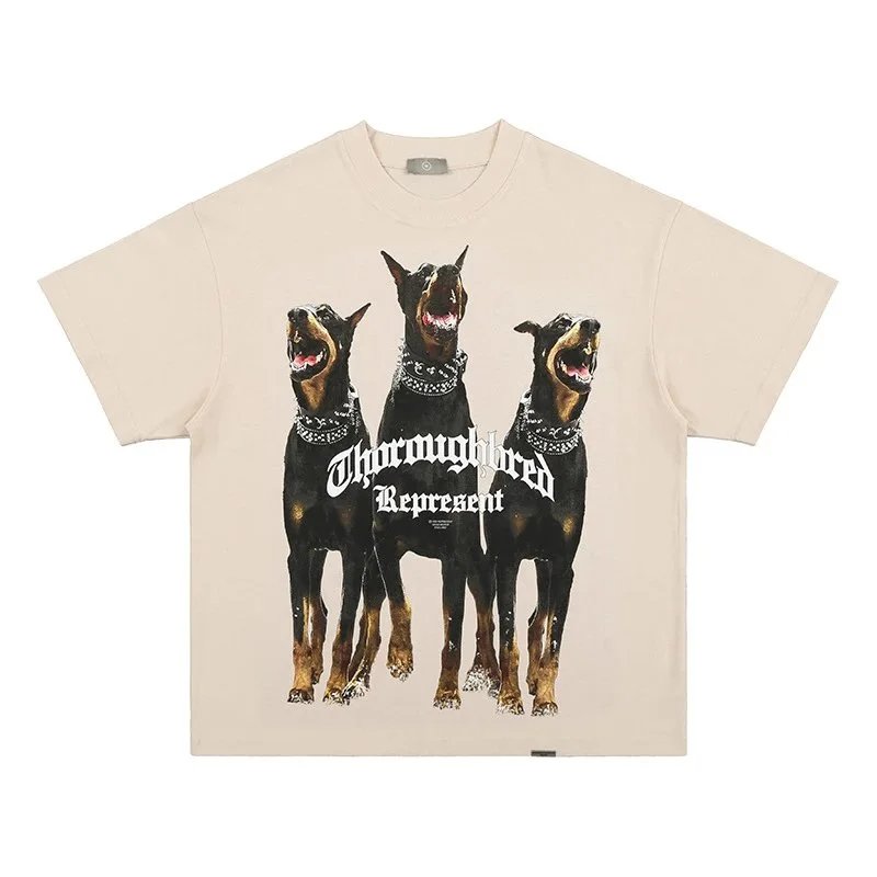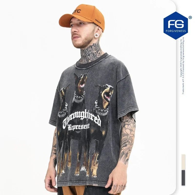 Men's distressed gray t-shirt featuring three Dobermans with 'Thornmughbred Represent' text, modeled with an orange NYC cap and visible tattoos. Bold streetwear design from Forgiveness brand.