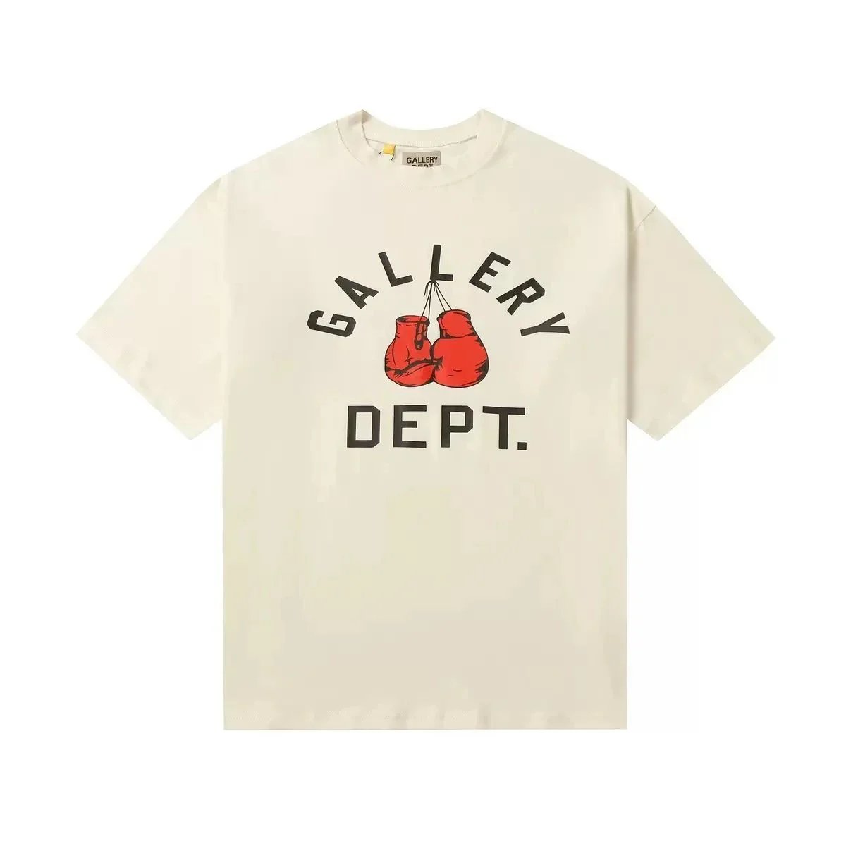 Black Gallery Dept. t-shirt featuring a bold graphic of red boxing gloves under the arched 'GALLERY DEPT.' text. Designed for urban streetwear appeal with a distinctive athletic motif.
