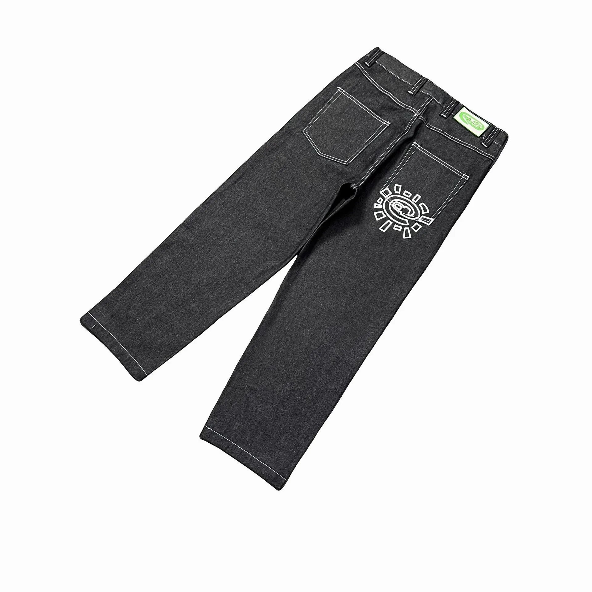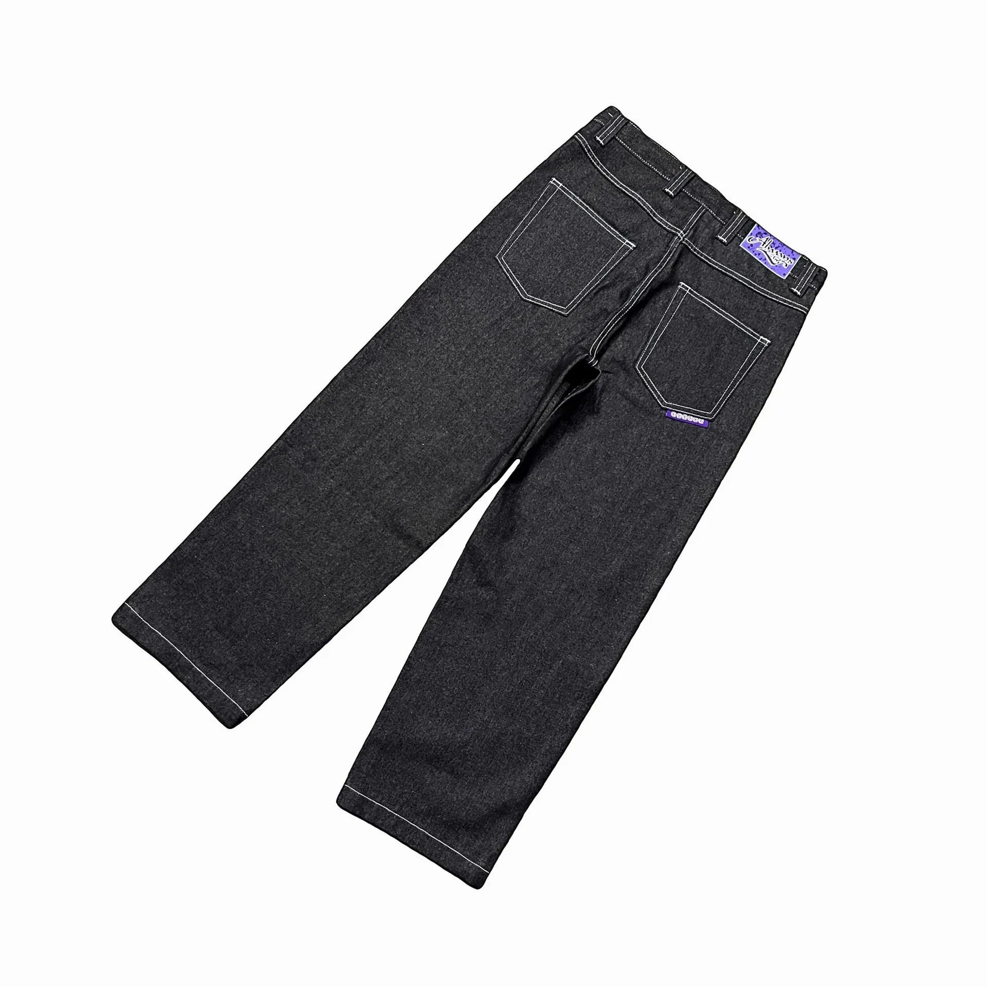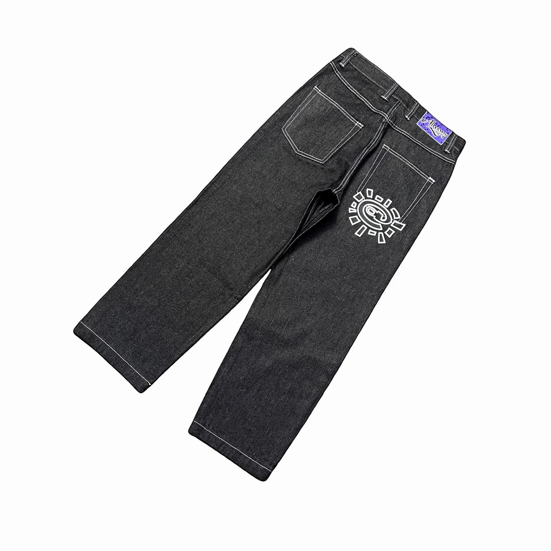 Stylish denim pants featuring a unique logo print on the back pocket. Available in multiple colors including black, blue, and various labeled variants for a bold fashion statement.
