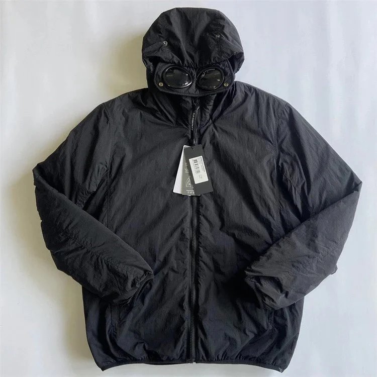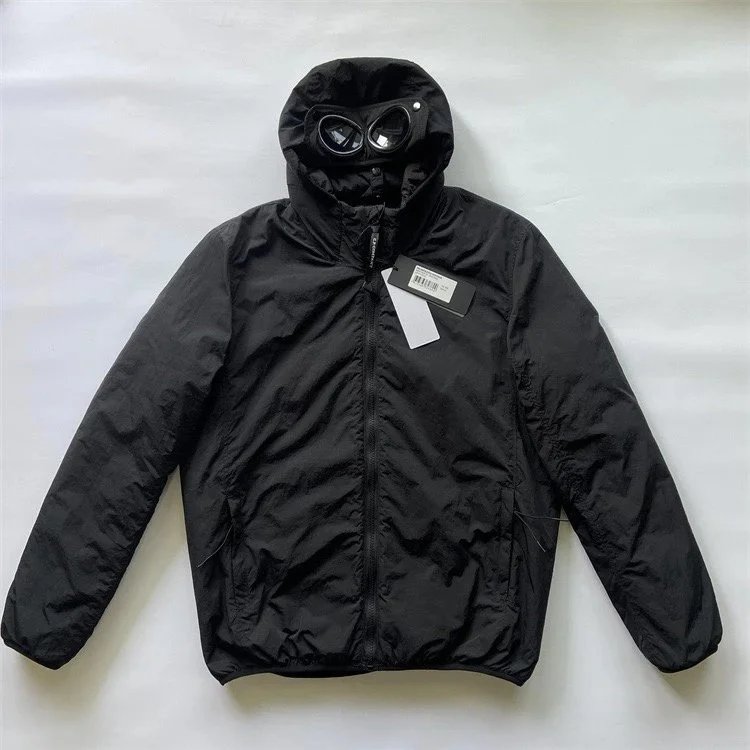 Stylish and functional puffer jackets featuring an integrated aviator-style hood with goggles for ultimate protection and a futuristic look. Available in teal, blue, and black.