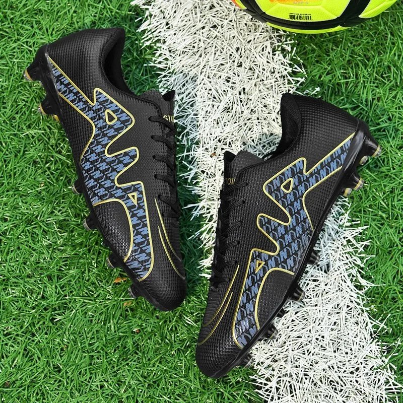 Durable black and gold soccer cleats designed for artificial turf, featuring enhanced grip and comfort for peak performance on the field.