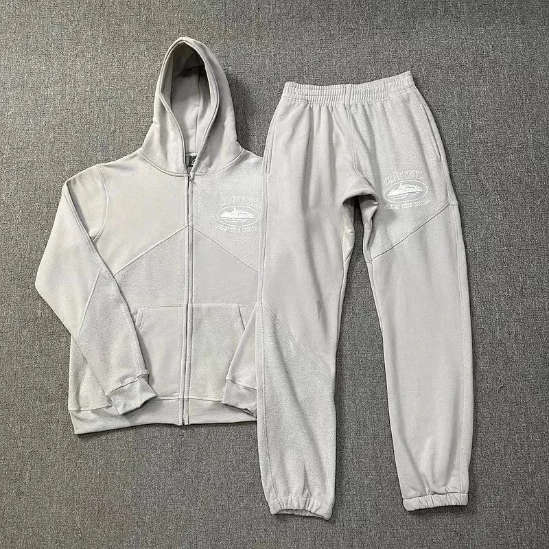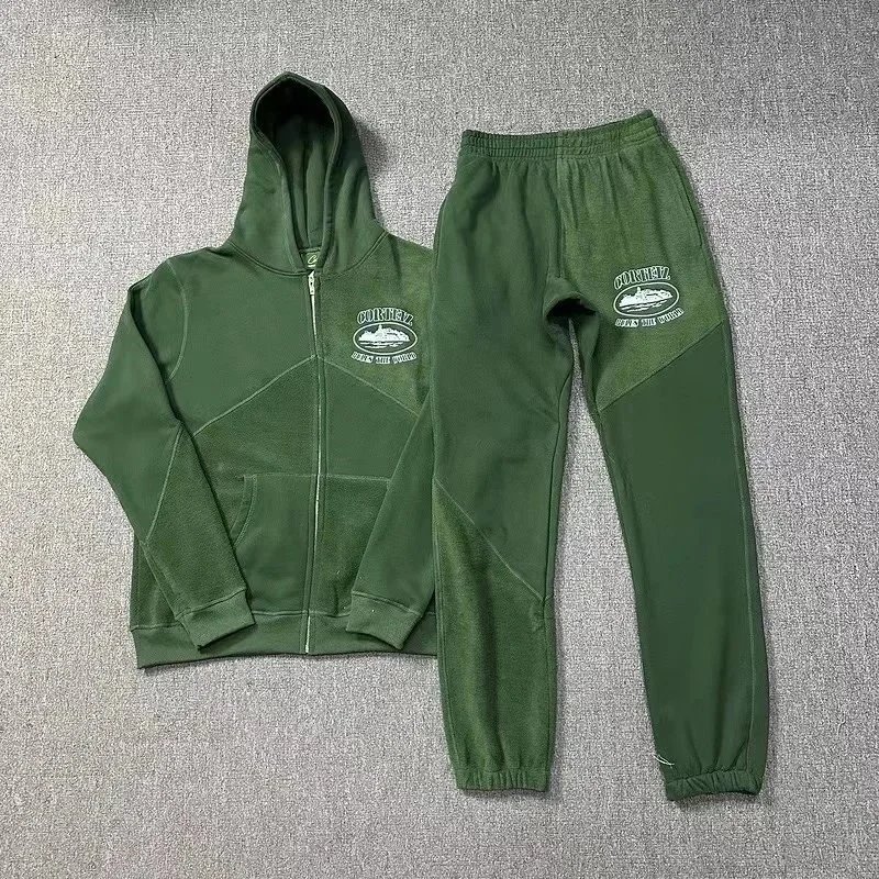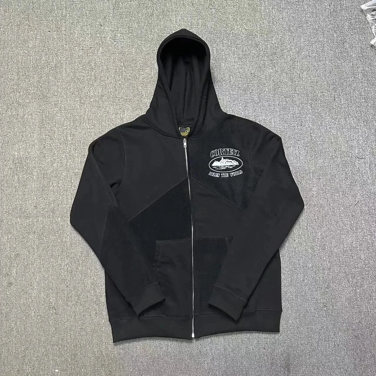 Stay comfortable and stylish with this black zip-up hoodie and matching jogger set featuring a bold graphic patch on the chest and thigh.
