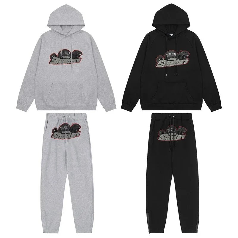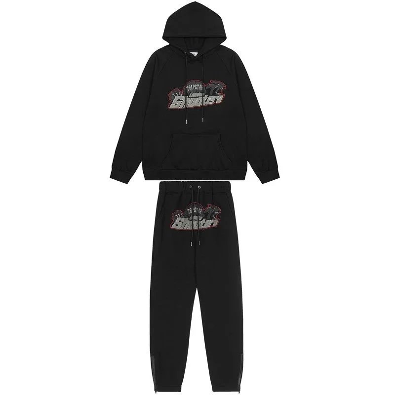 Stay cozy and stylish with this black hoodie and jogger set featuring bold graphic prints. Perfect for casual wear or lounging at home.