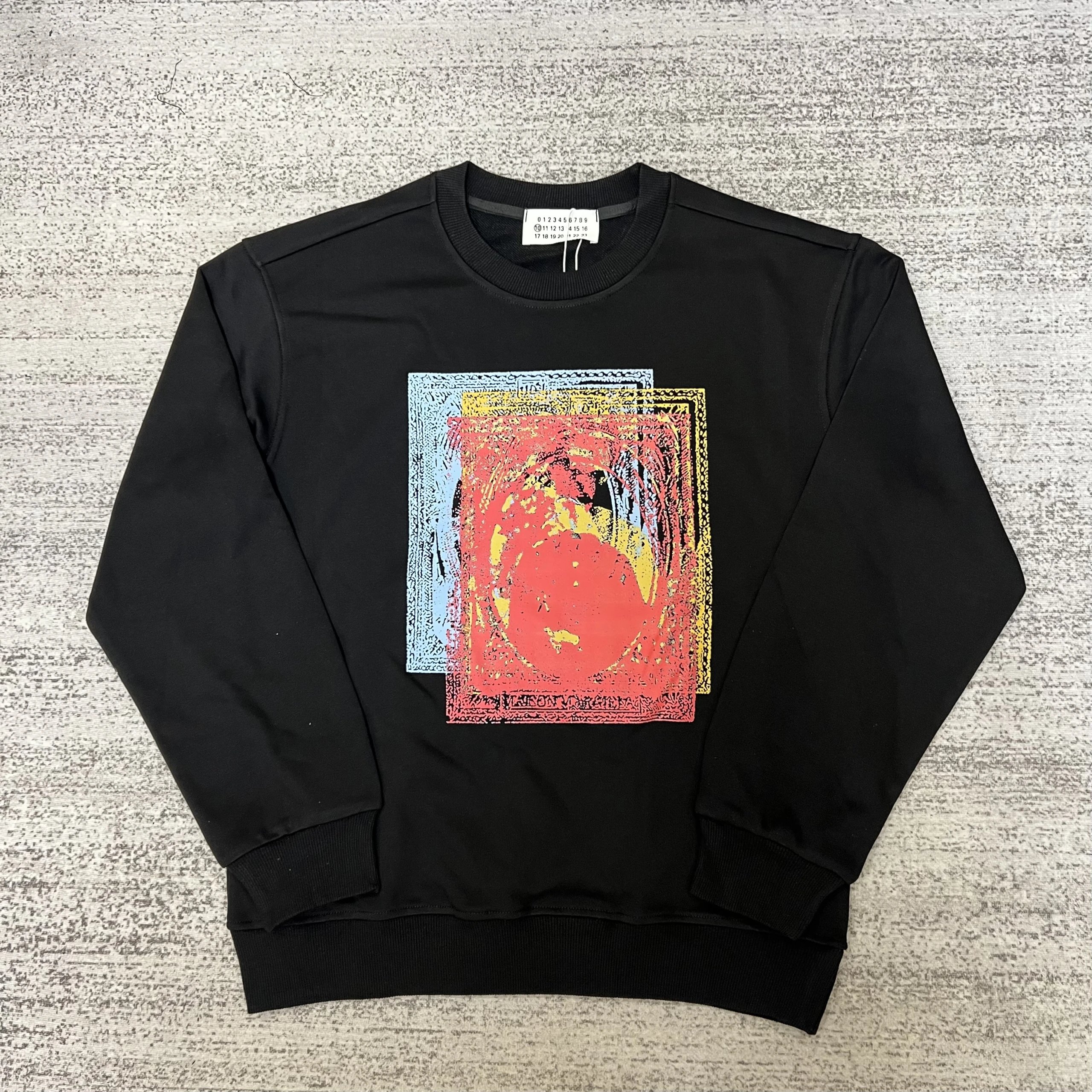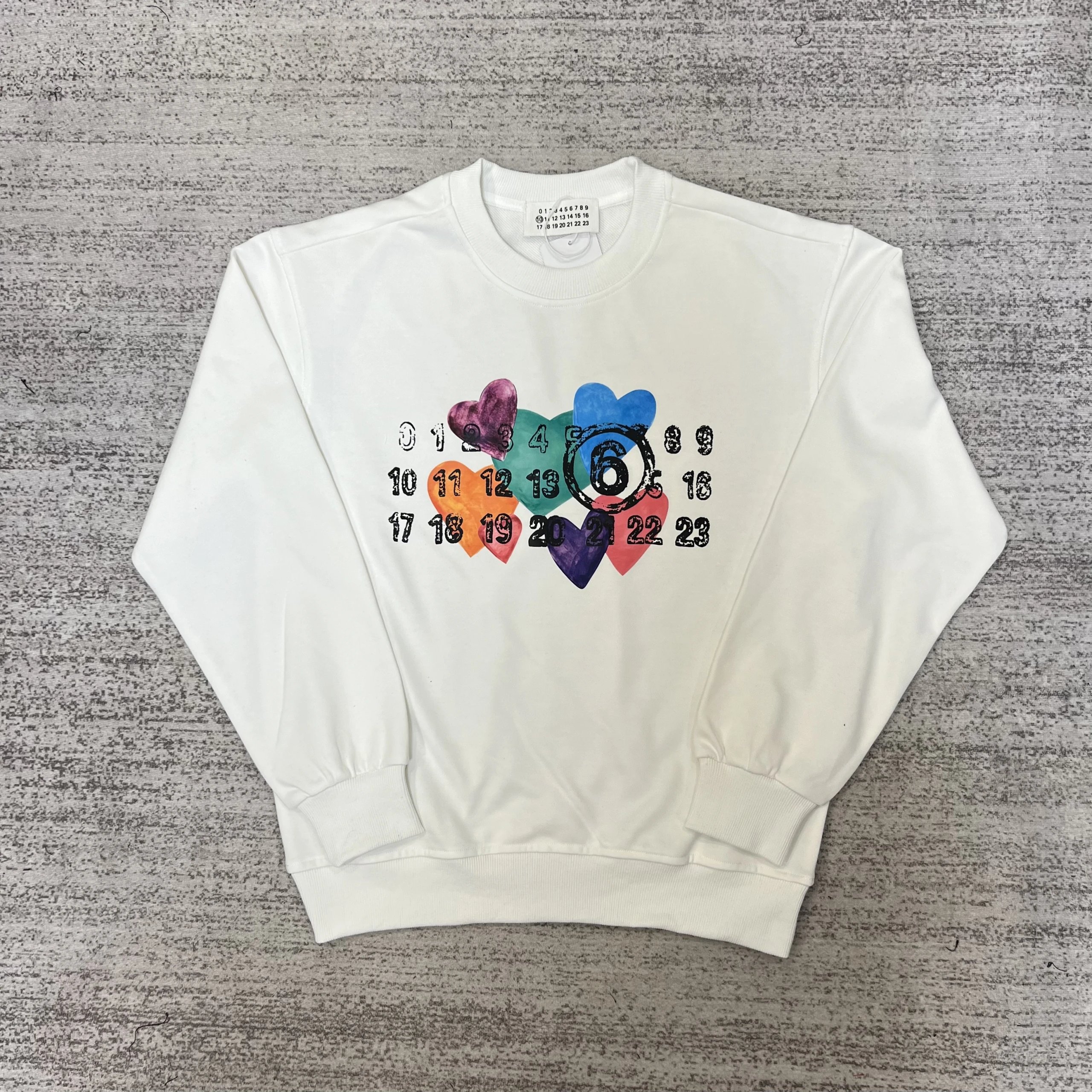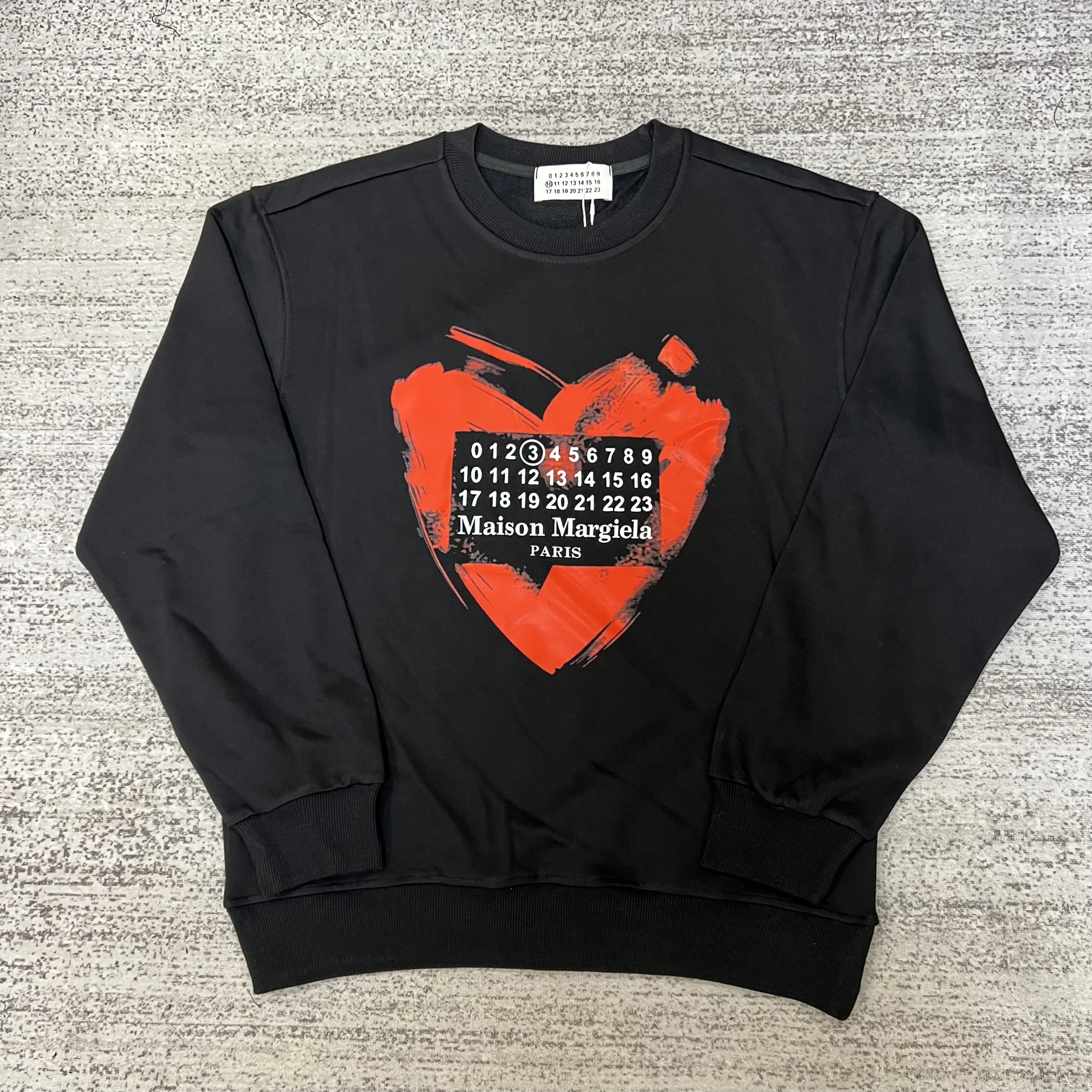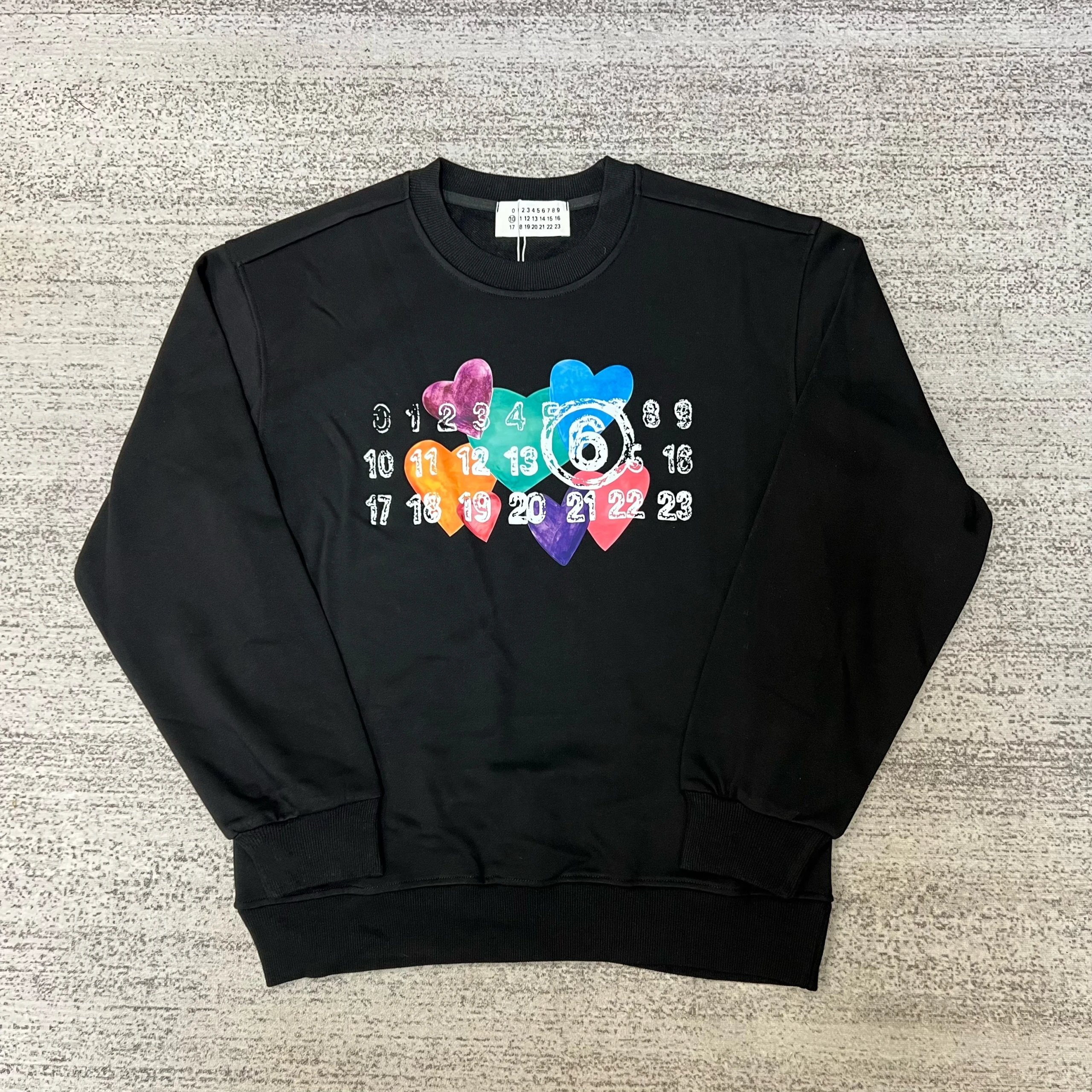 Stylish black sweatshirt featuring a vibrant rainbow heart design with bold white numbers. Perfect for casual and streetwear looks.