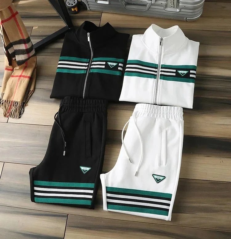 Stylish black track suit featuring green and white stripe detailing. Perfect for casual wear or light workouts.