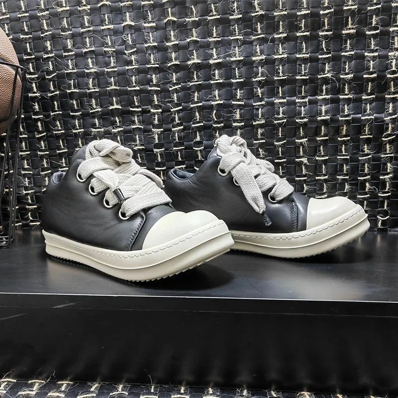 Stylish black and white low-top sneakers featuring thick platform soles and textured rope laces for a bold, modern look.