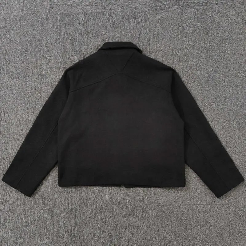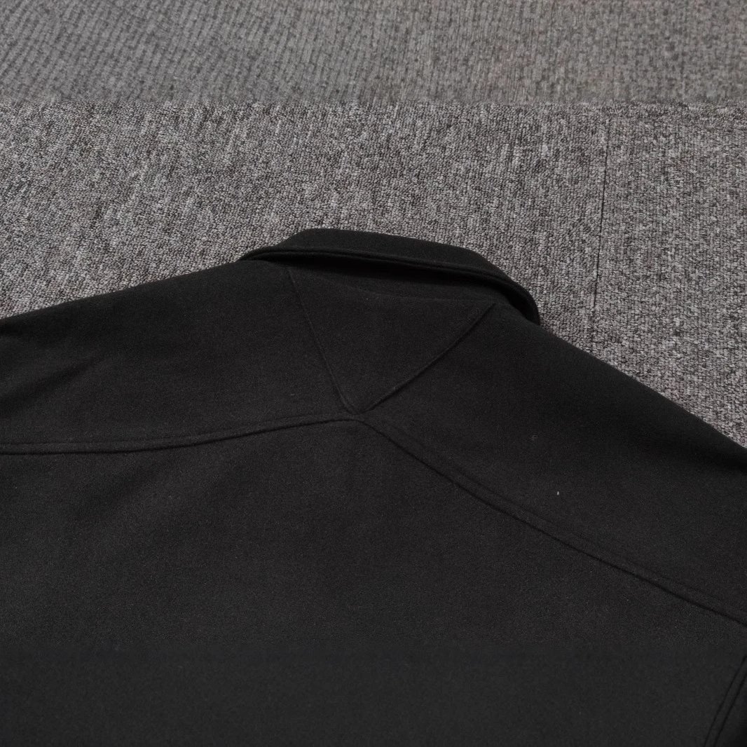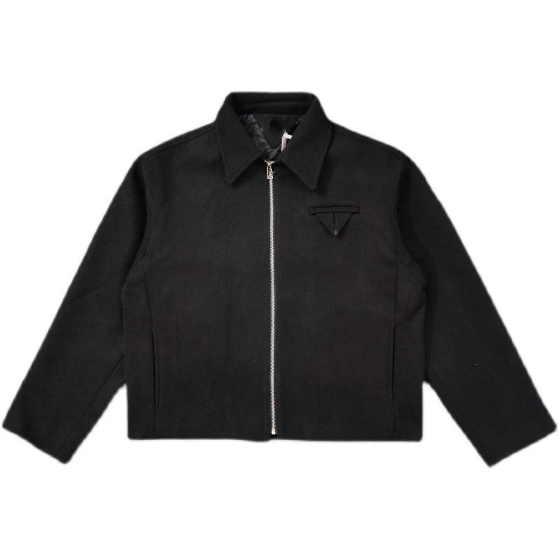 Stylish black zip-up jacket featuring a minimalist design with a distinctive triangular logo pocket. Ideal for modern, clean looks.