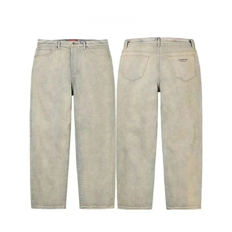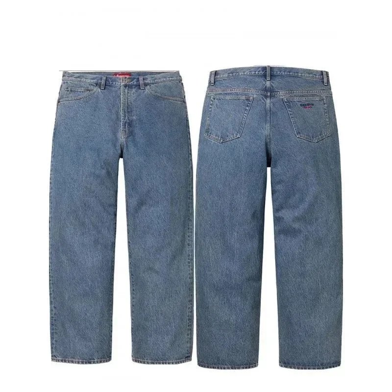 Comfortable and durable blue denim jeans with a classic straight-leg cut, perfect for everyday wear. Showcasing front and back views for detailed styling.