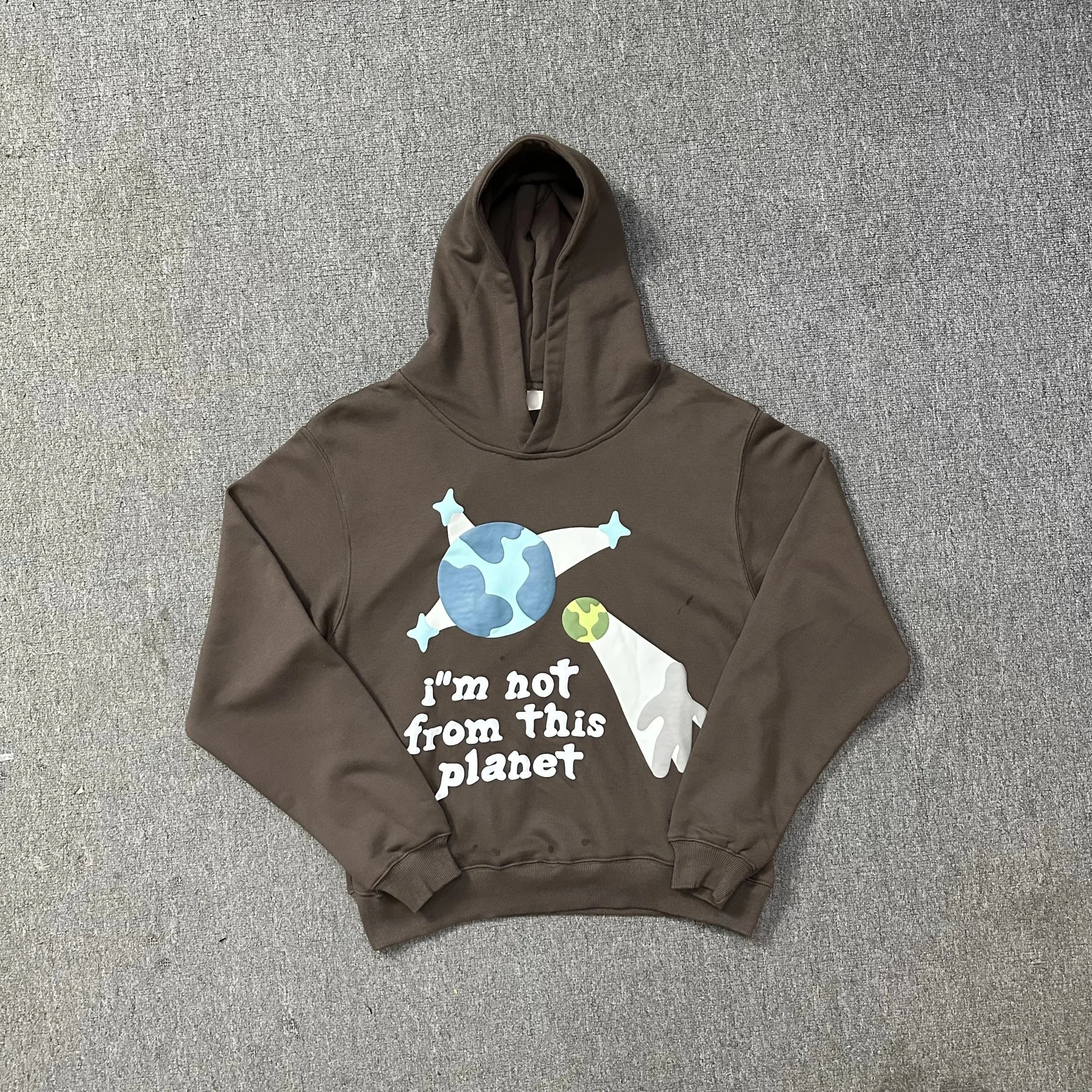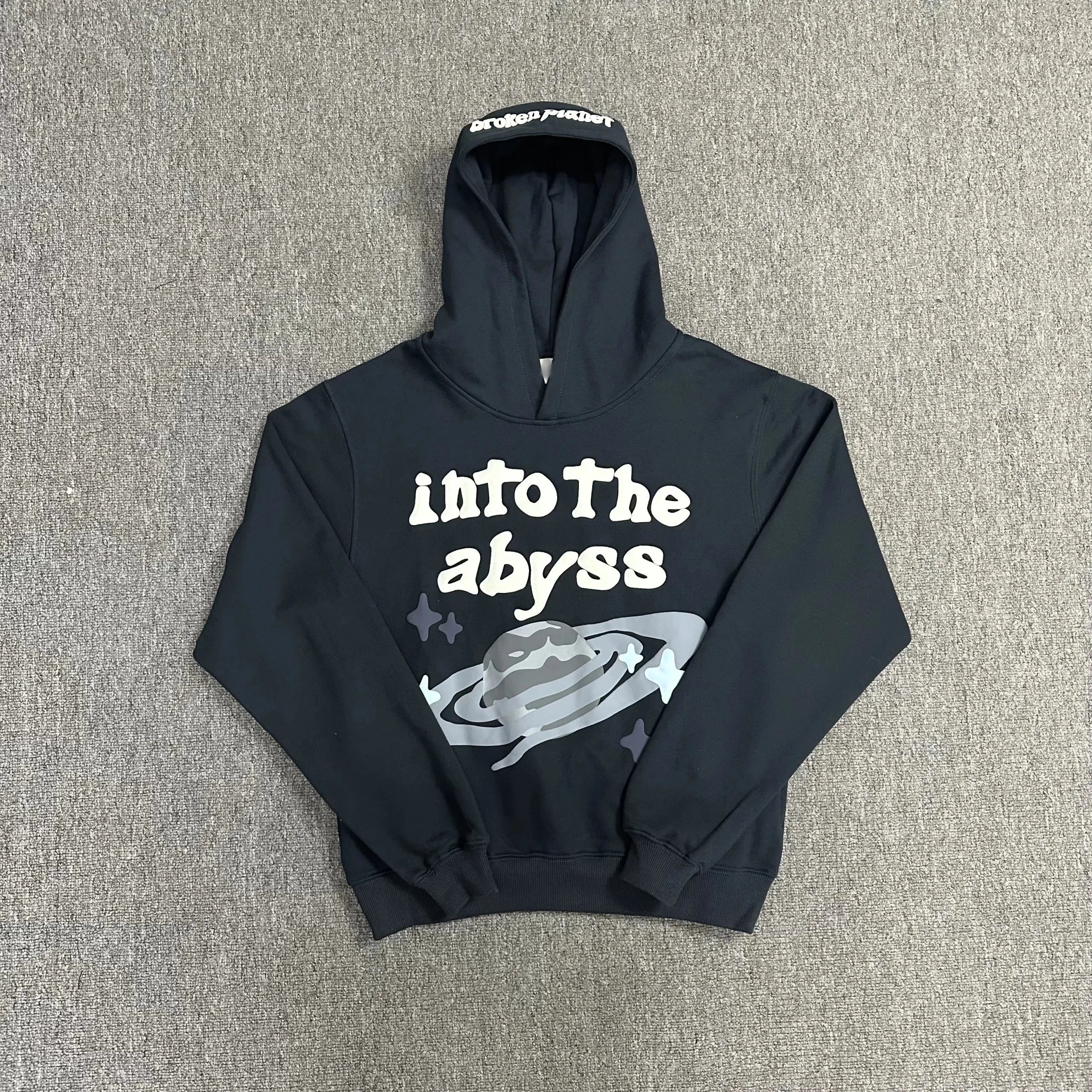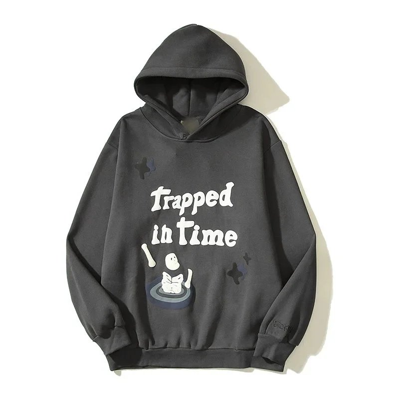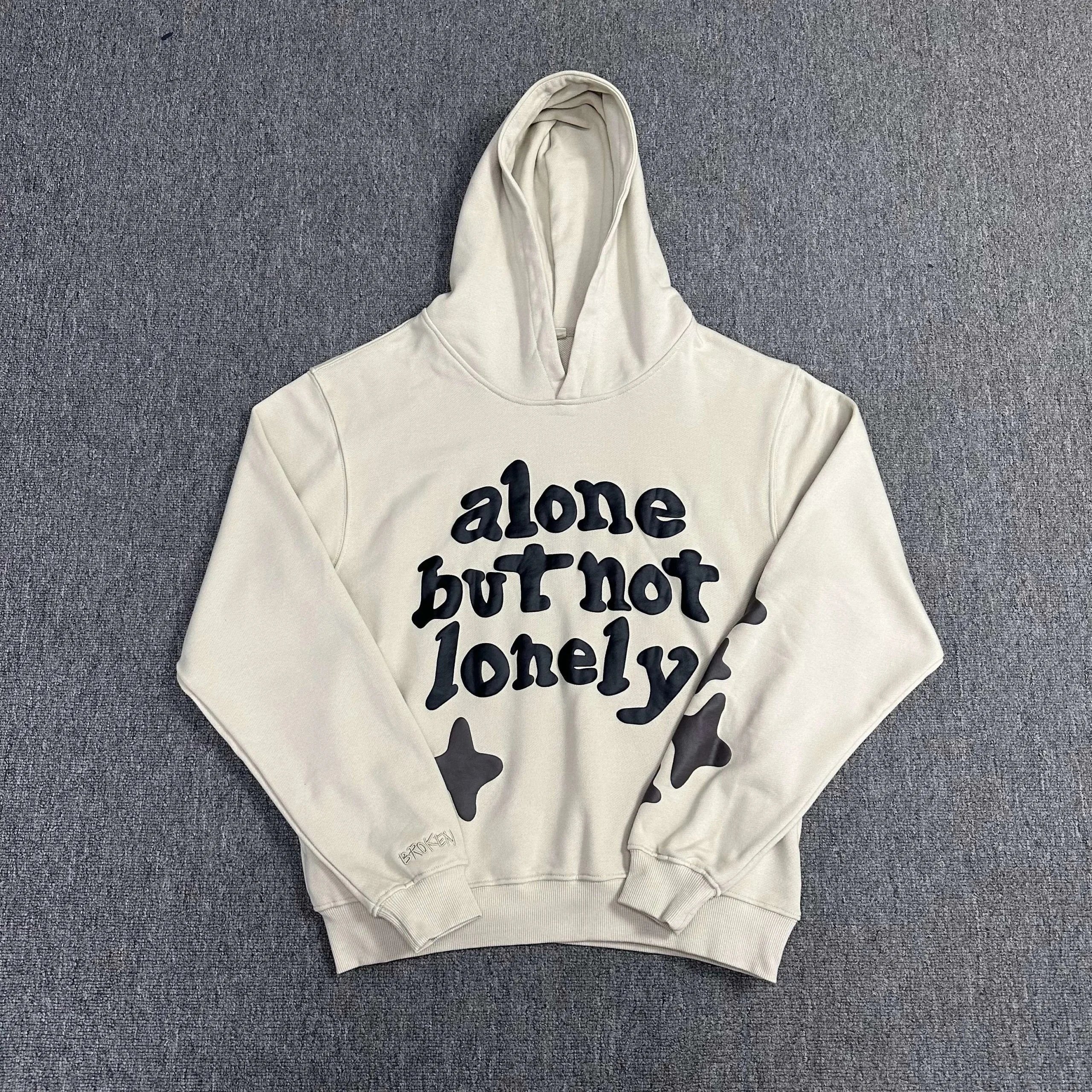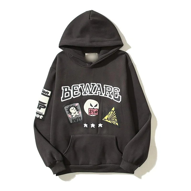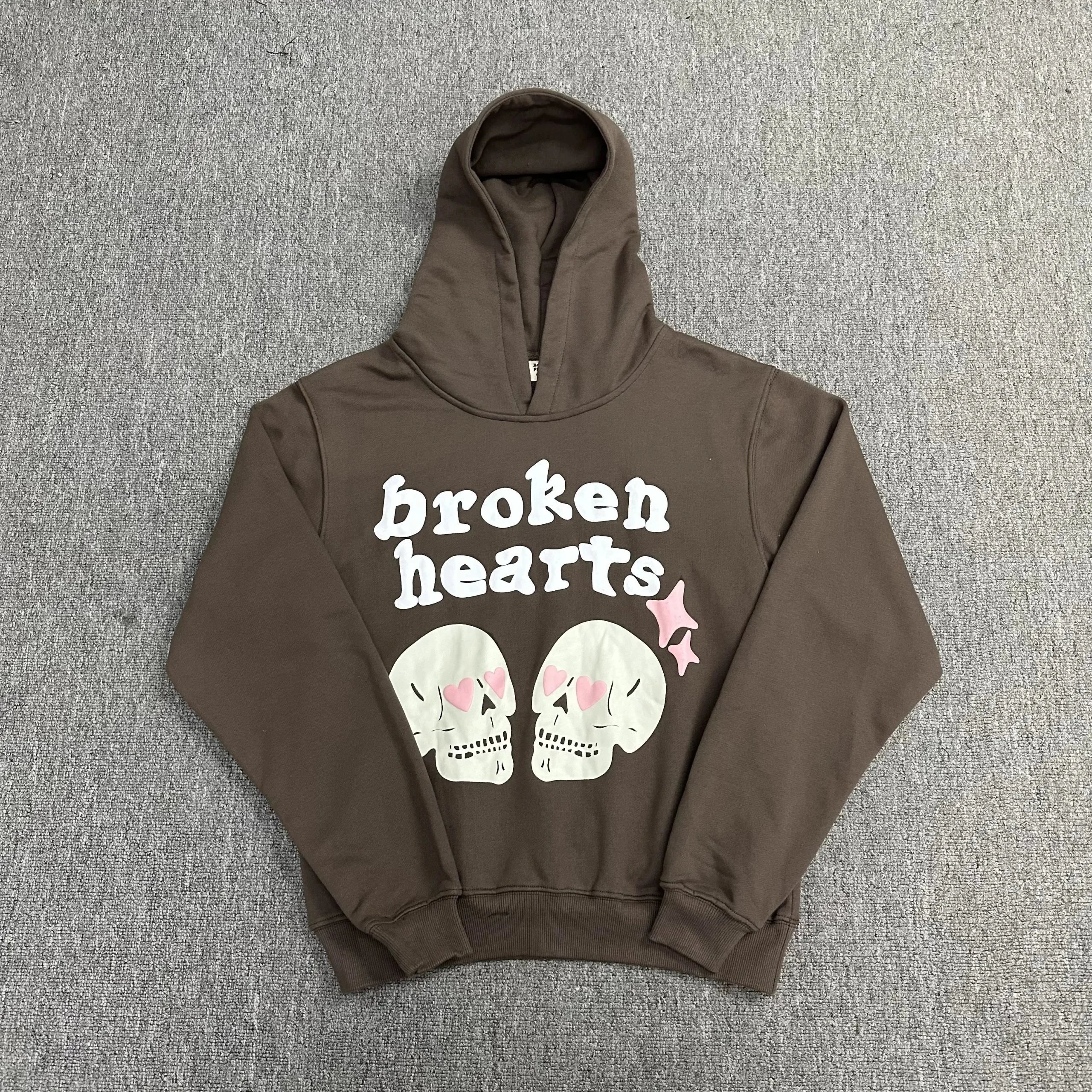 Edgy cream hoodie featuring flaming skull eyes and 'broken hearts' text. Perfect for gothic, punk, or alternative streetwear styles.