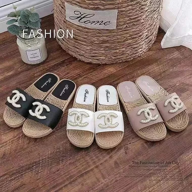 Elevate your summer look with these stylish slide sandals featuring a signature double-C logo and woven espadrille soles. Perfect for casual outings and beach days.