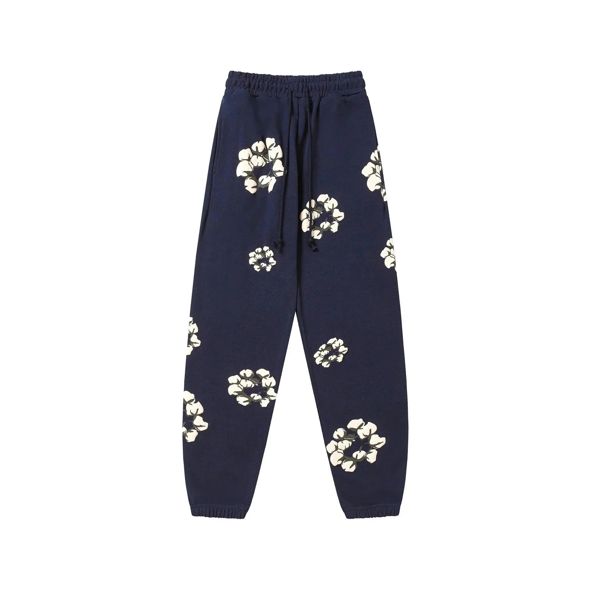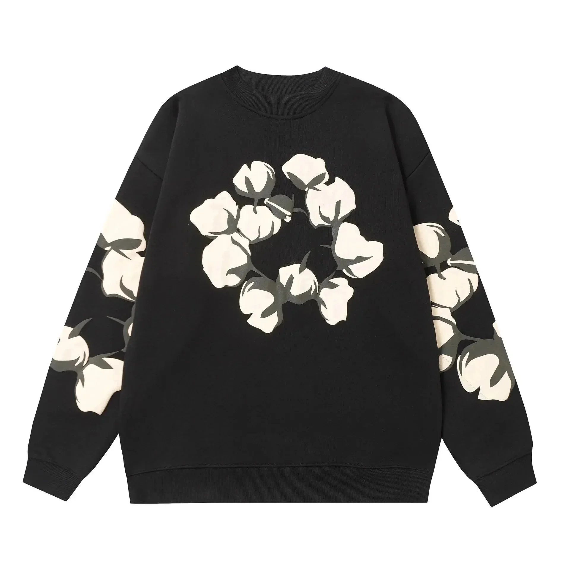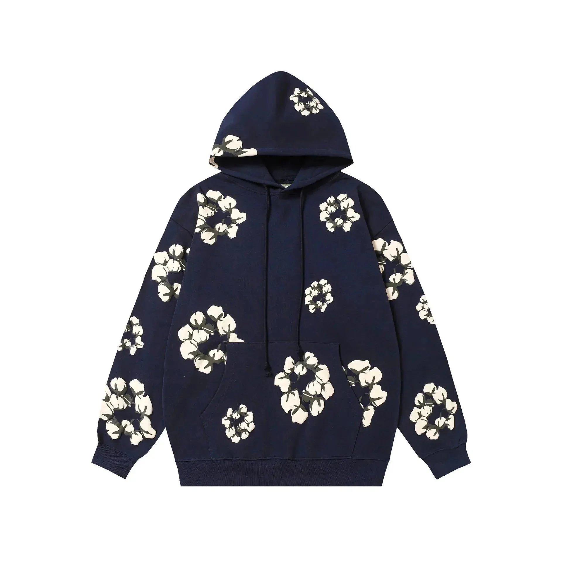 Stay cozy and stylish with this navy blue sweatshirt featuring a bold cotton flower print on the chest and sleeves. Perfect for casual wear with a touch of nature-inspired flair.