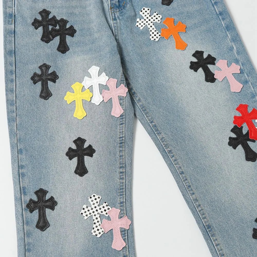Explore a vibrant collection of cross-embroidered denim pants featuring colorful patterns and unique designs. Perfect for bold fashion statements and urban streetwear styles.