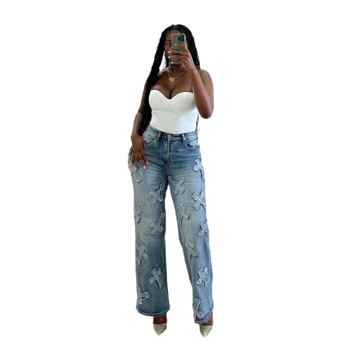 Make a bold fashion statement with these high-waisted wide-leg jeans featuring distinctive cross embroidery. Perfect for edgy, contemporary style.