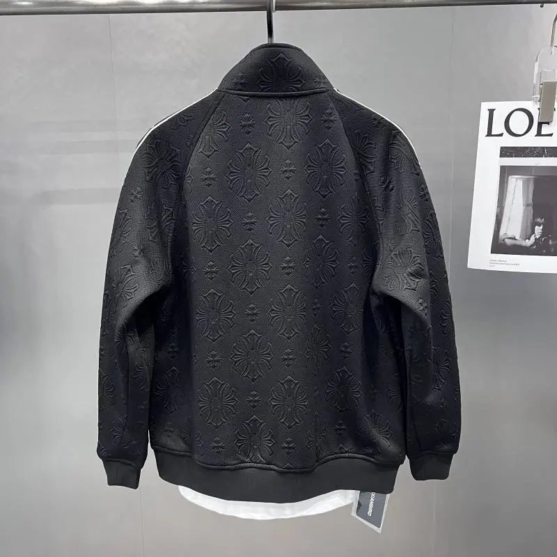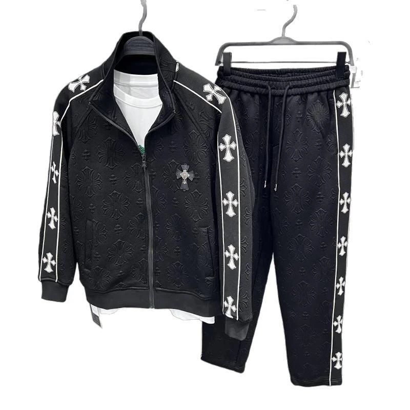 Stylish black track suit featuring white cross embroidery and textured patterns. Perfect for casual wear or athletic activities.