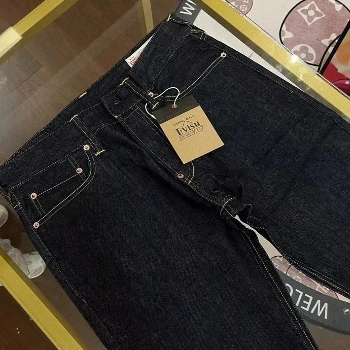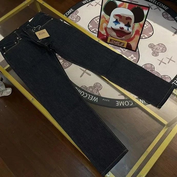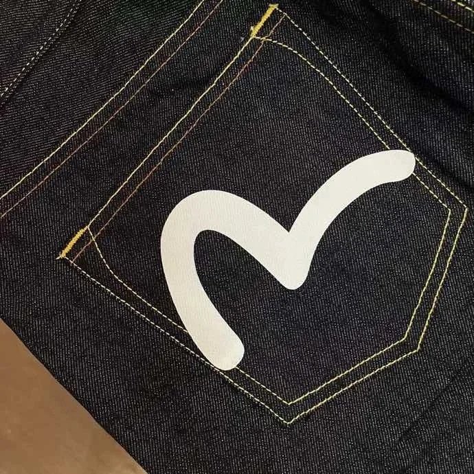 Stylish dark blue jeans featuring distinctive white smiley face embroidery on the back pockets. Perfect for casual wear with a fun, artistic twist.