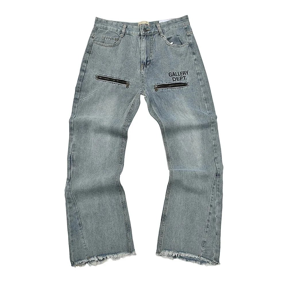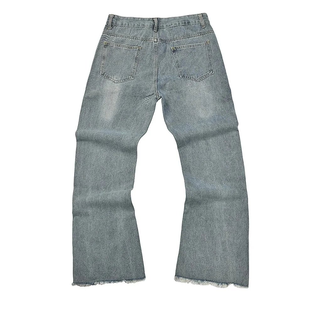 Classic blue denim jeans featuring a distressed design with intentional rips and frayed edges for a rugged, vintage-inspired look. Perfect for casual wear with a bold statement.