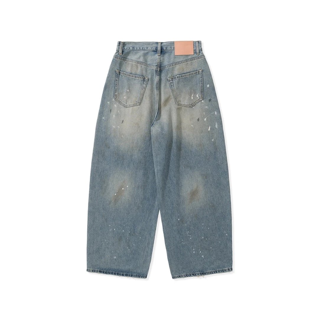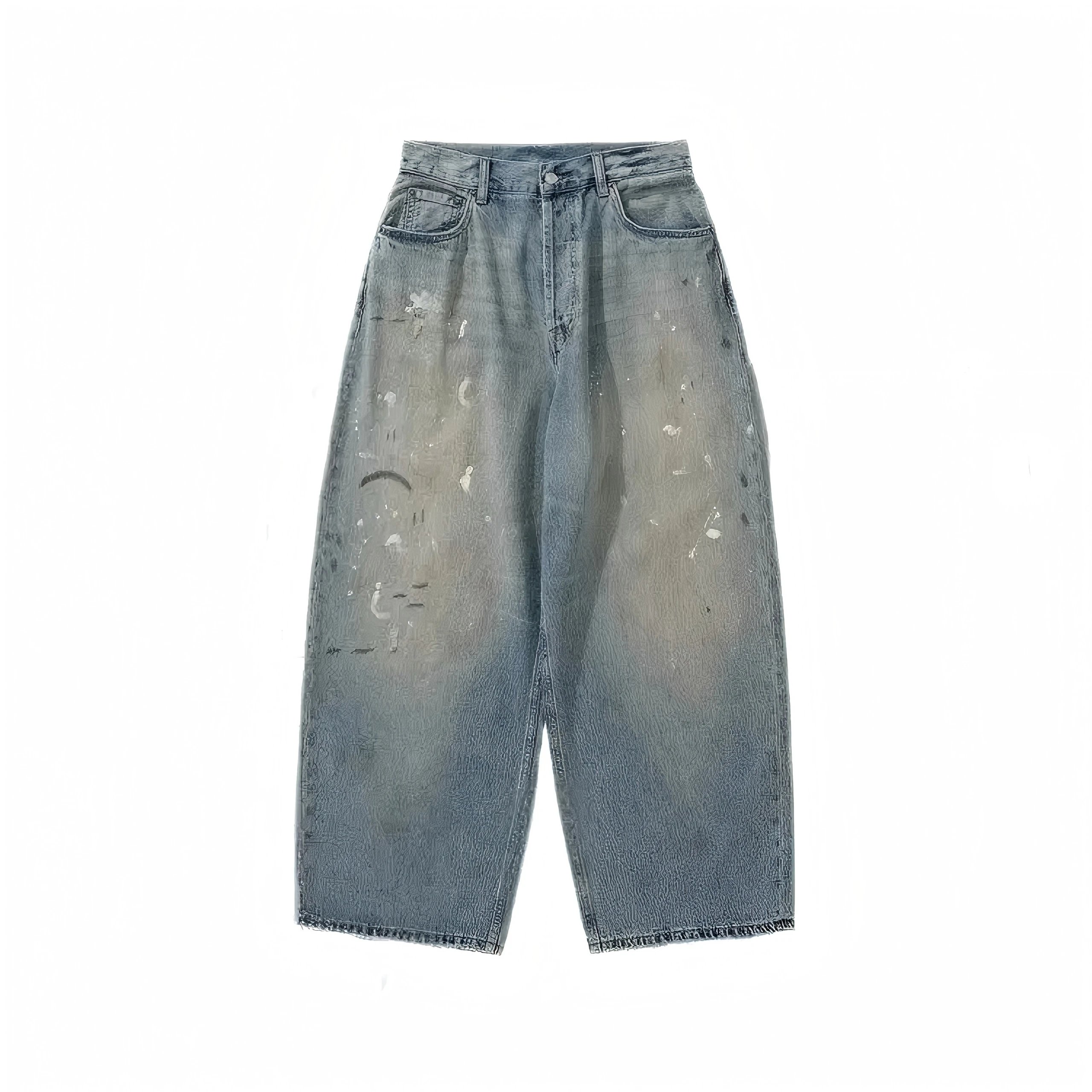 Stylish wide-leg denim pants featuring a unique paint splatter design and distressed detailing. Perfect for a casual, artistic look.