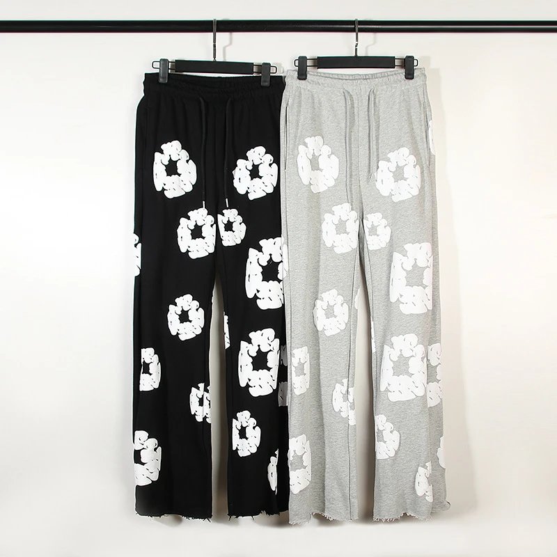 Comfortable wide-leg sweatpants featuring a bold floral print. Available in gray and black for versatile streetwear or loungewear styling.
