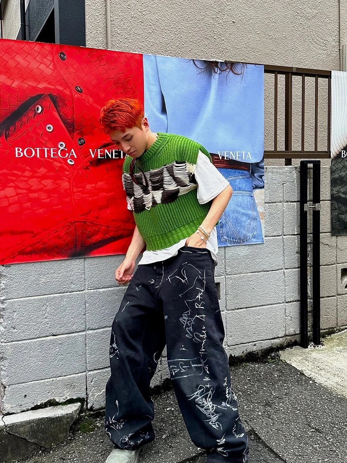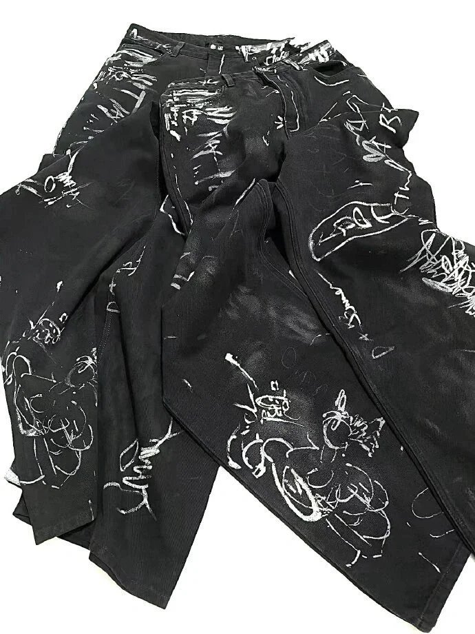 Bold black wide-leg pants featuring an all-over white graffiti print design. Perfect for making a statement in urban and streetwear styles.