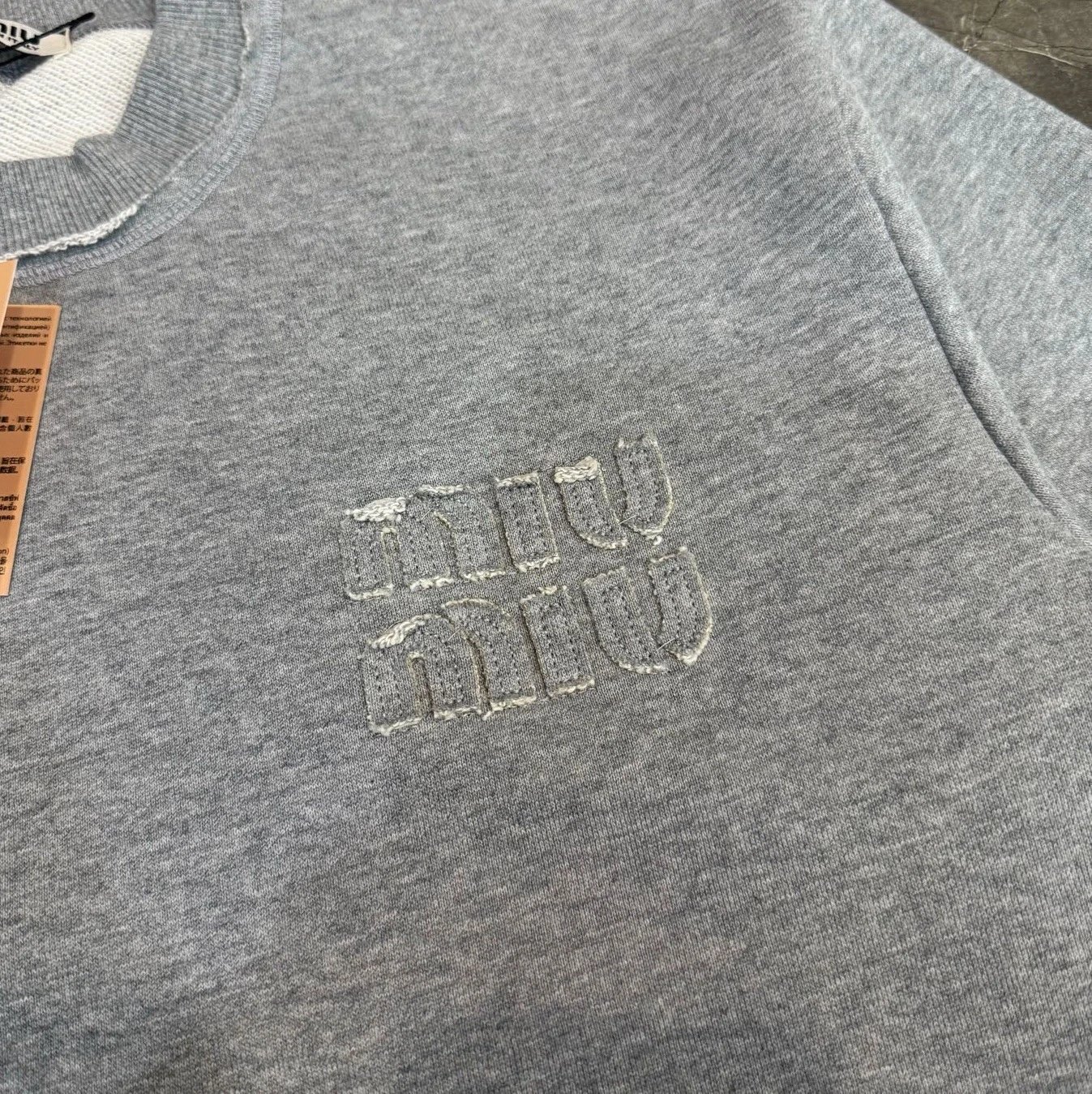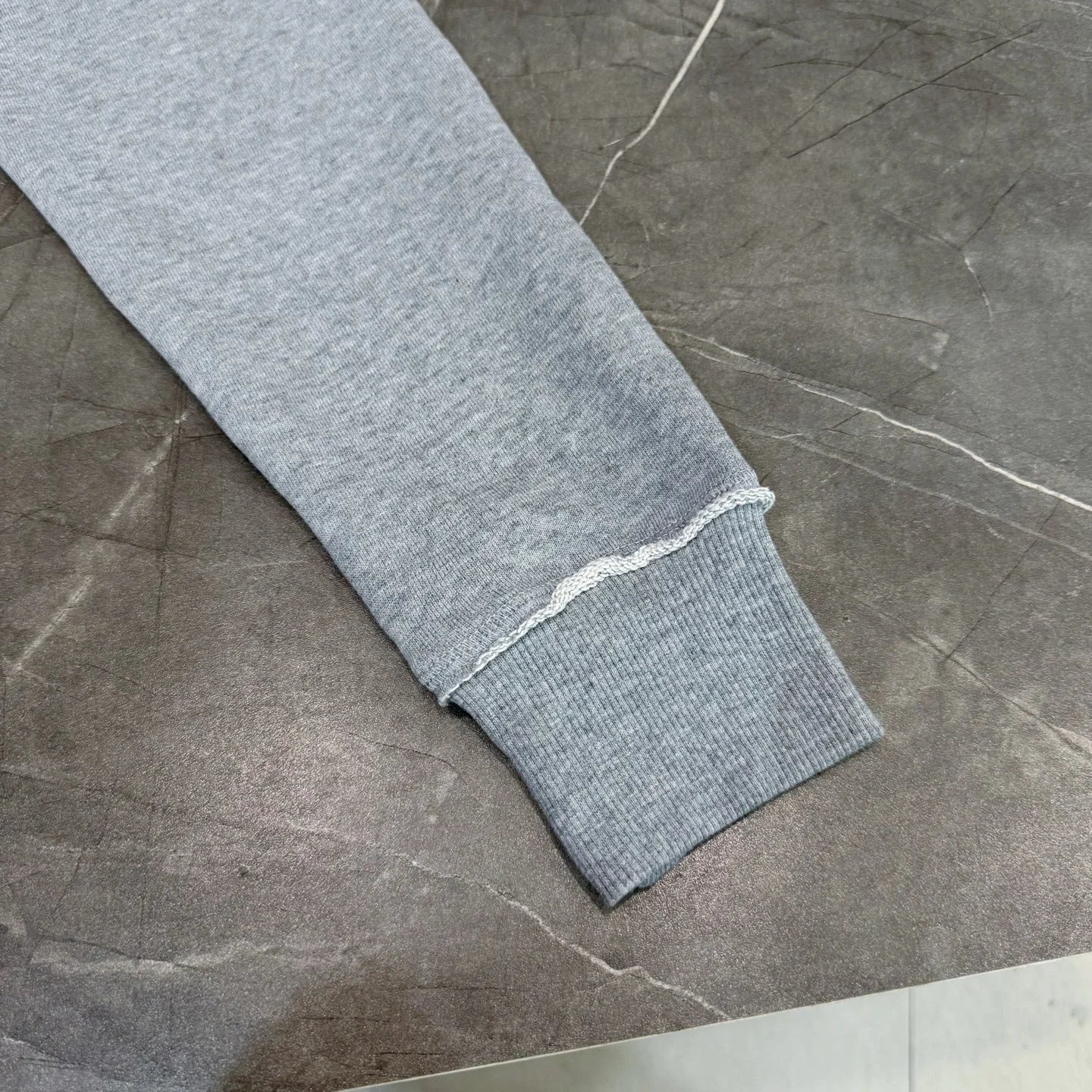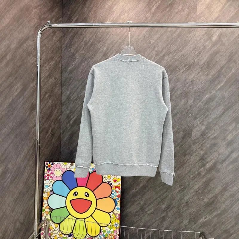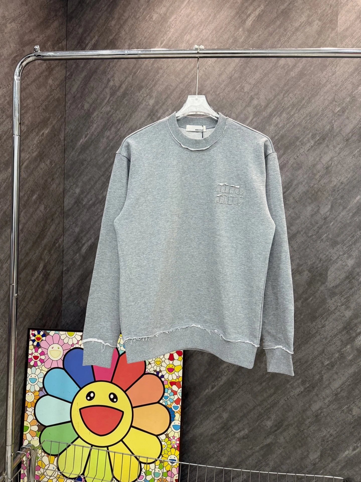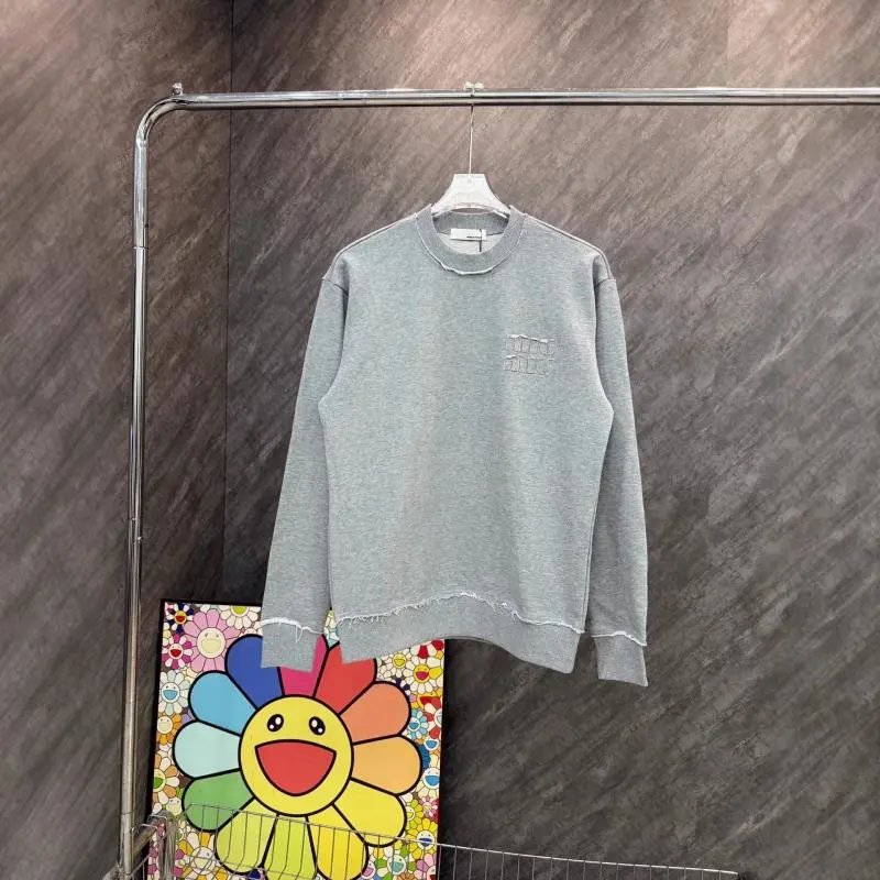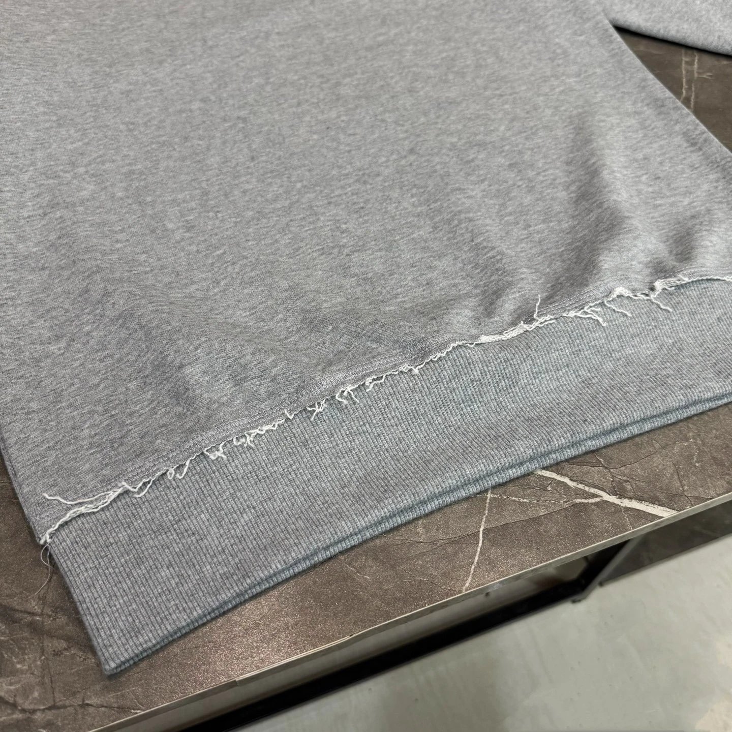 Stylish gray sweatshirt featuring a distressed hem and subtle embroidered logo. Perfect for casual wear with a modern edge.