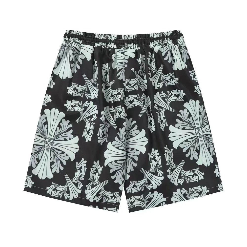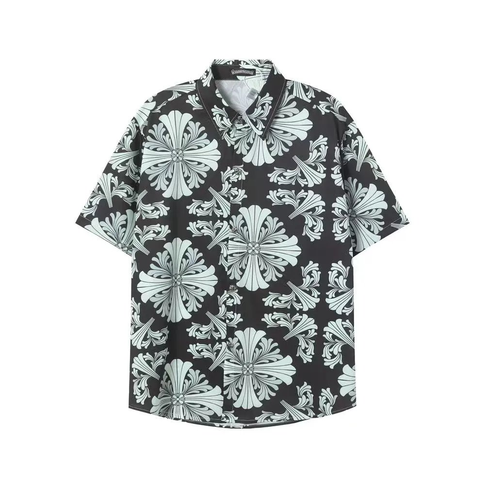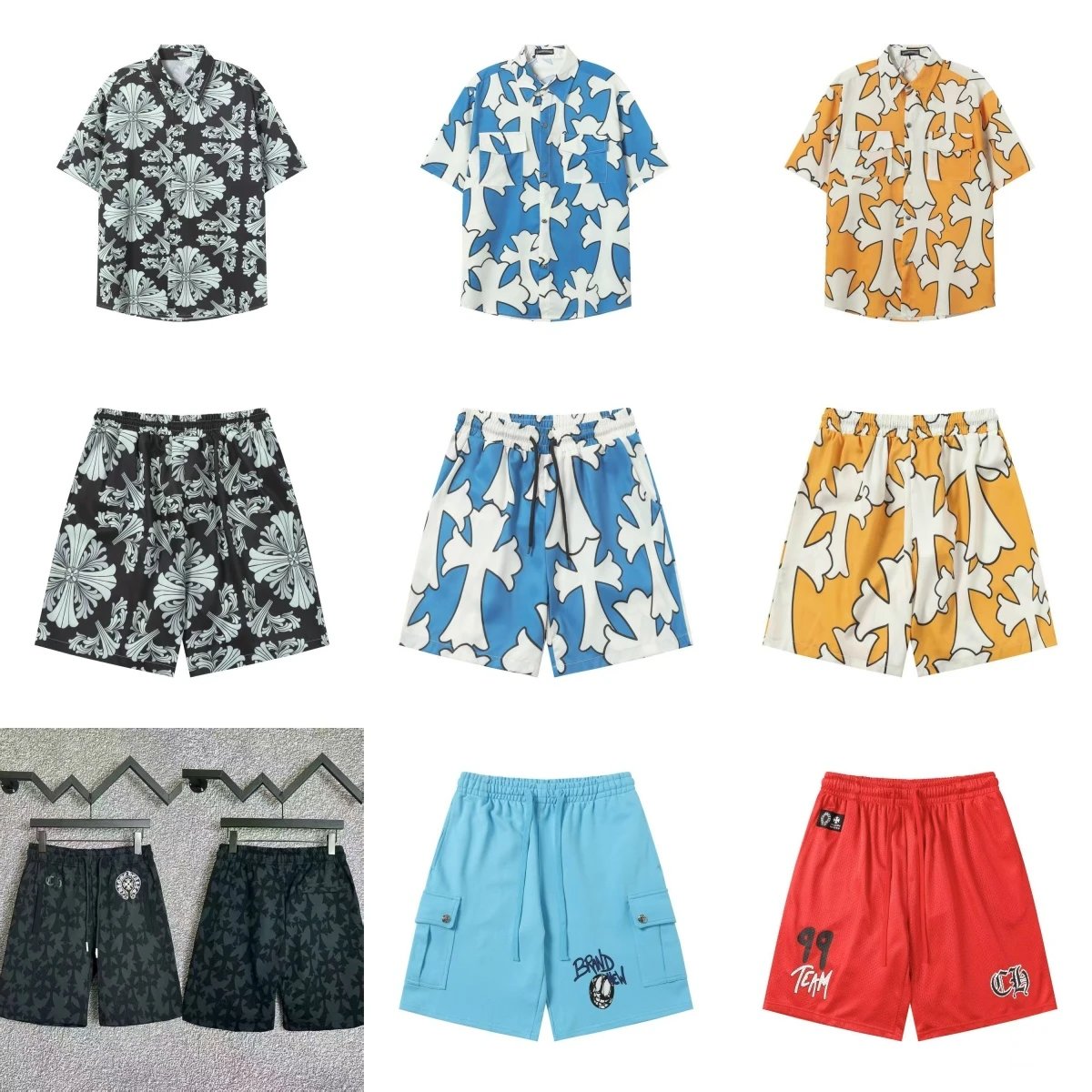 Stylish matching Hawaiian shirts and shorts sets featuring bold floral and cross patterns. Perfect for beach outings or casual summer wear.