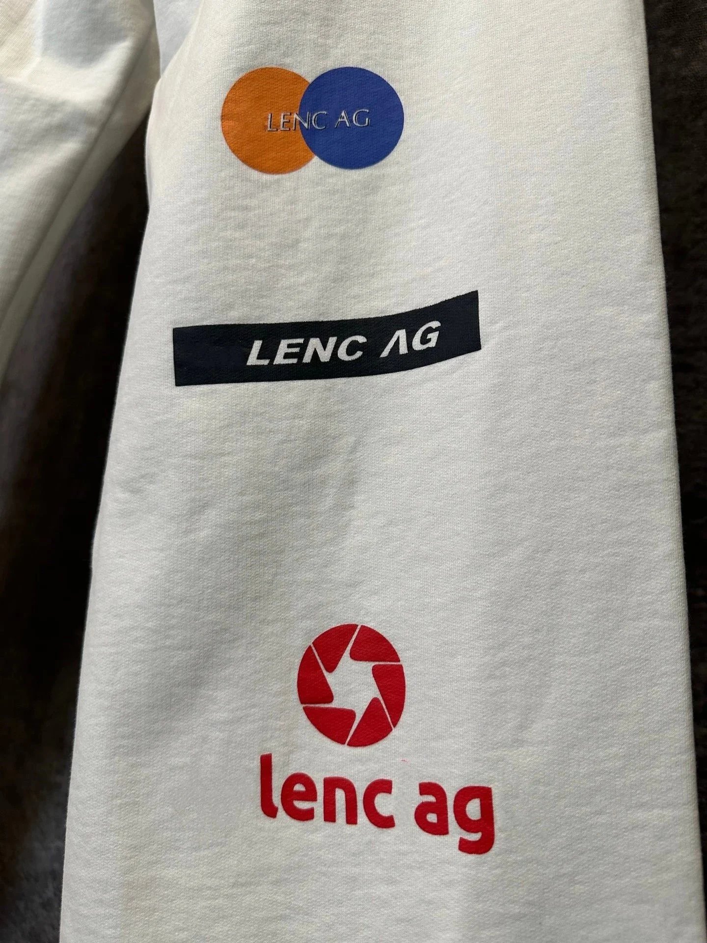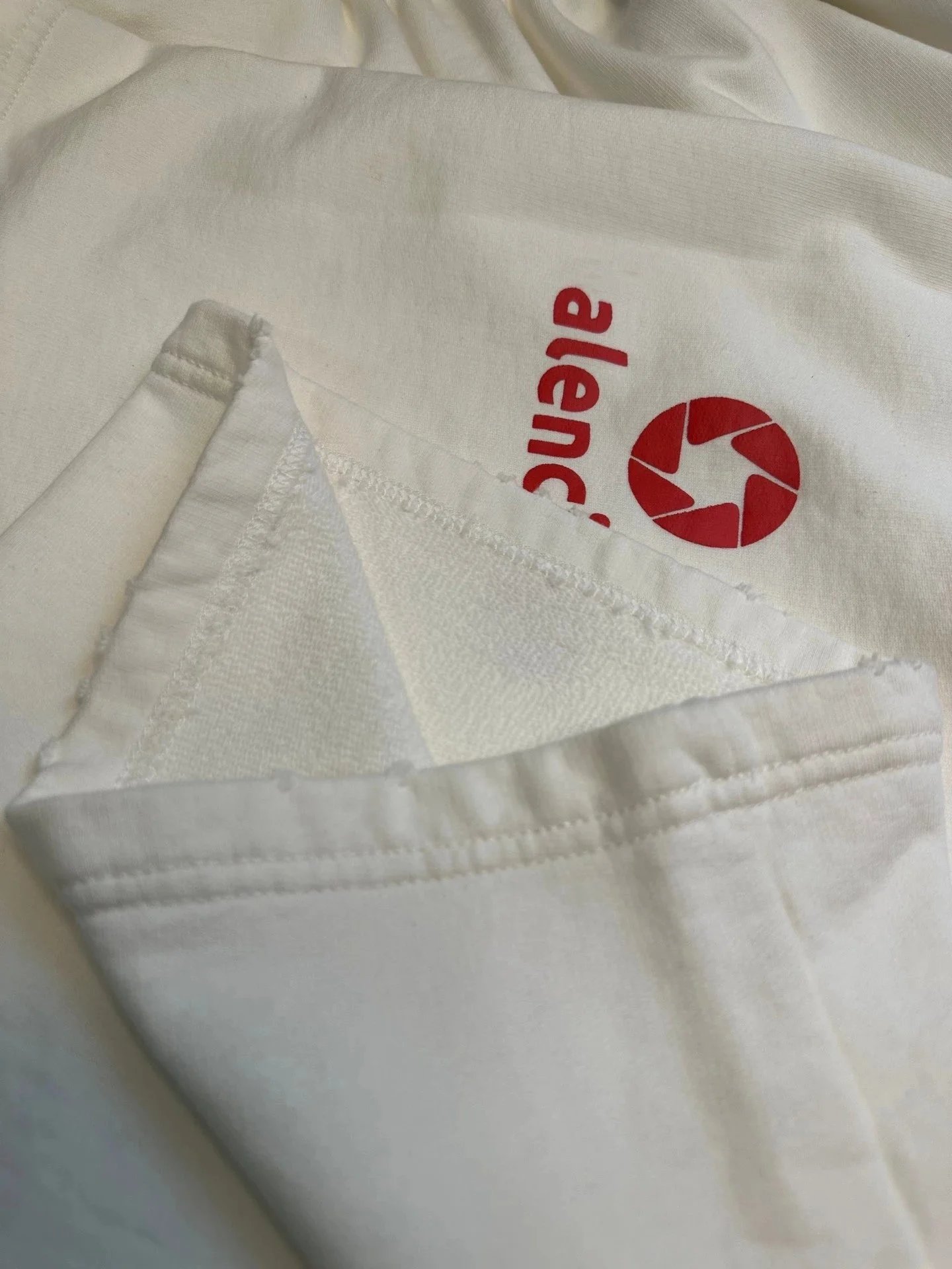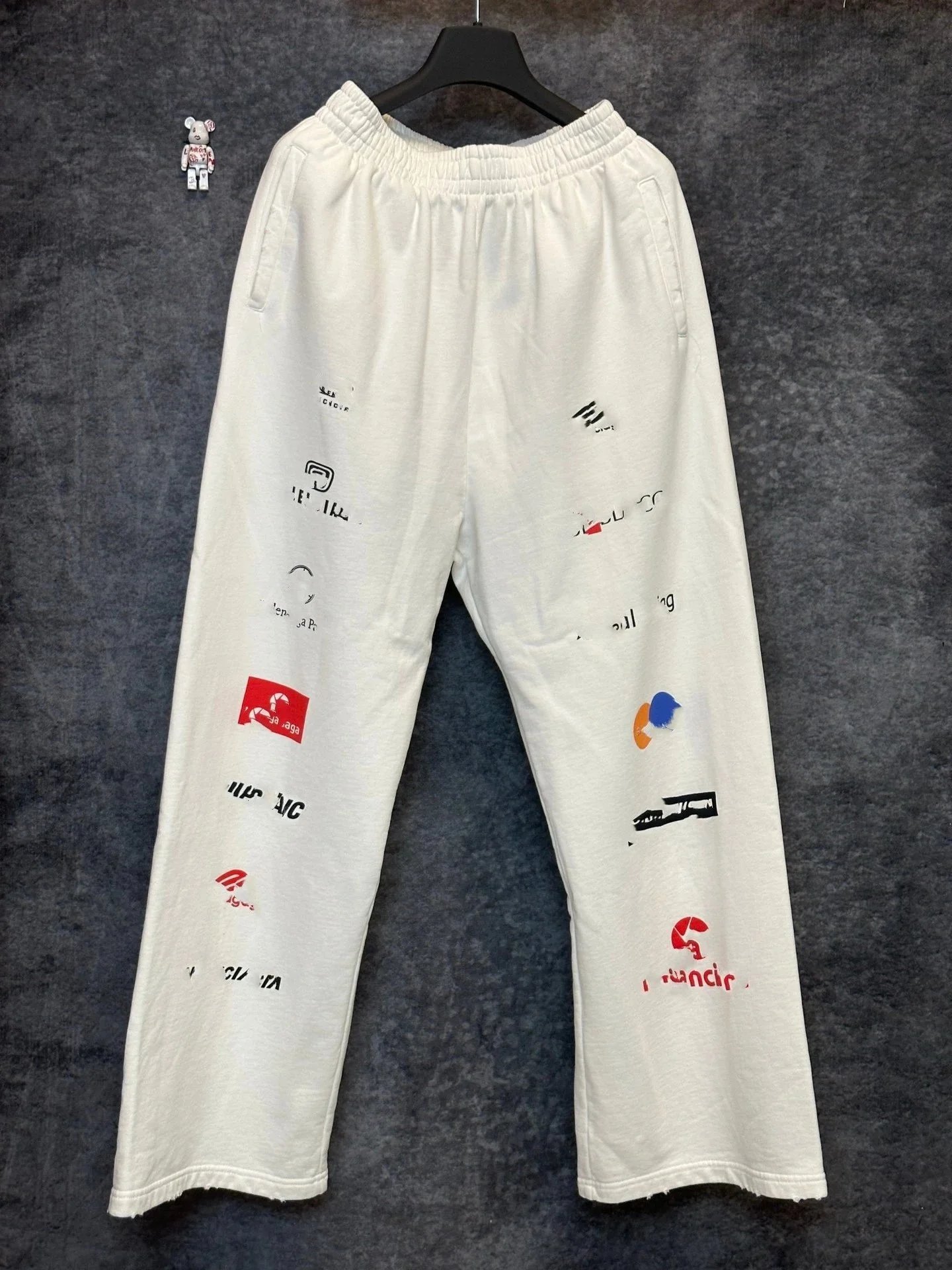 Stylish white sweatpants featuring a bold collage of colorful brand logos and patches. Perfect for casual streetwear looks with a unique, artistic flair.