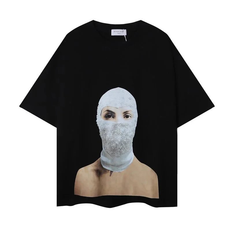 A curated collection of black and white t-shirts featuring bold mask-themed graphics and text prints like 'IH NOM UH NIT' and 'MASK ON'. Ideal for streetwear enthusiasts seeking statement pieces.