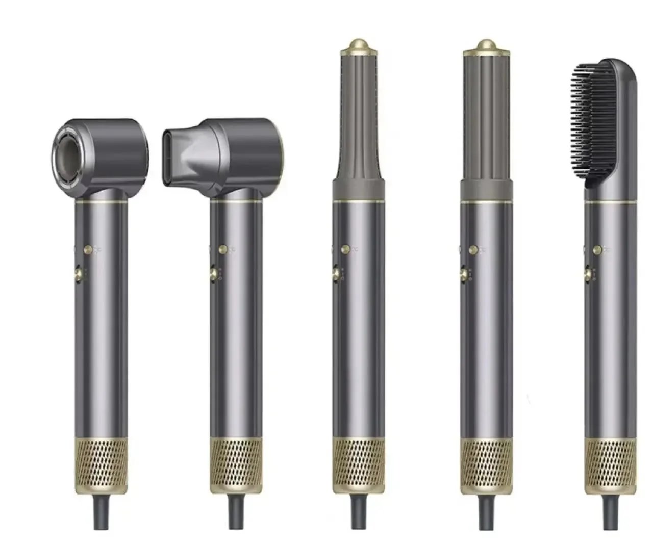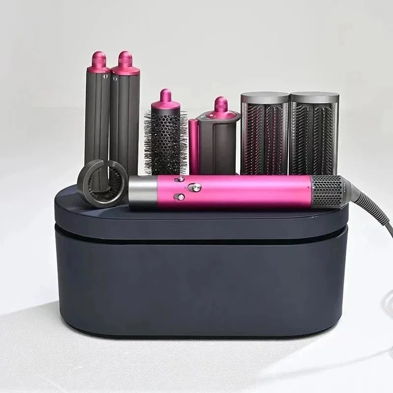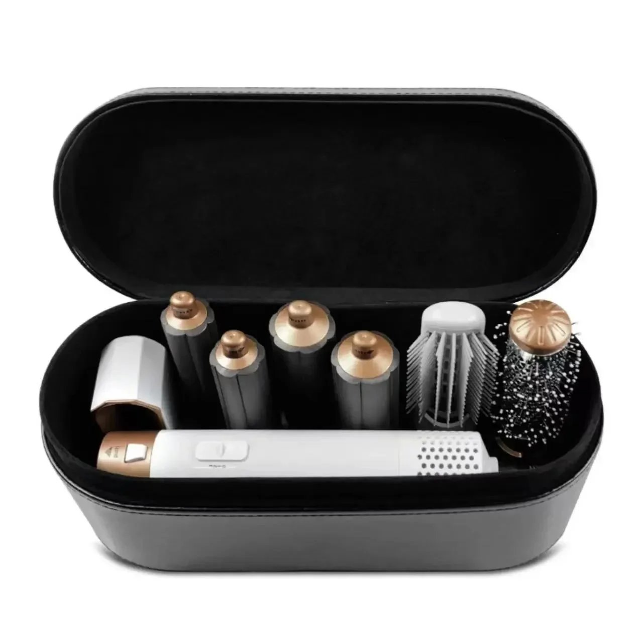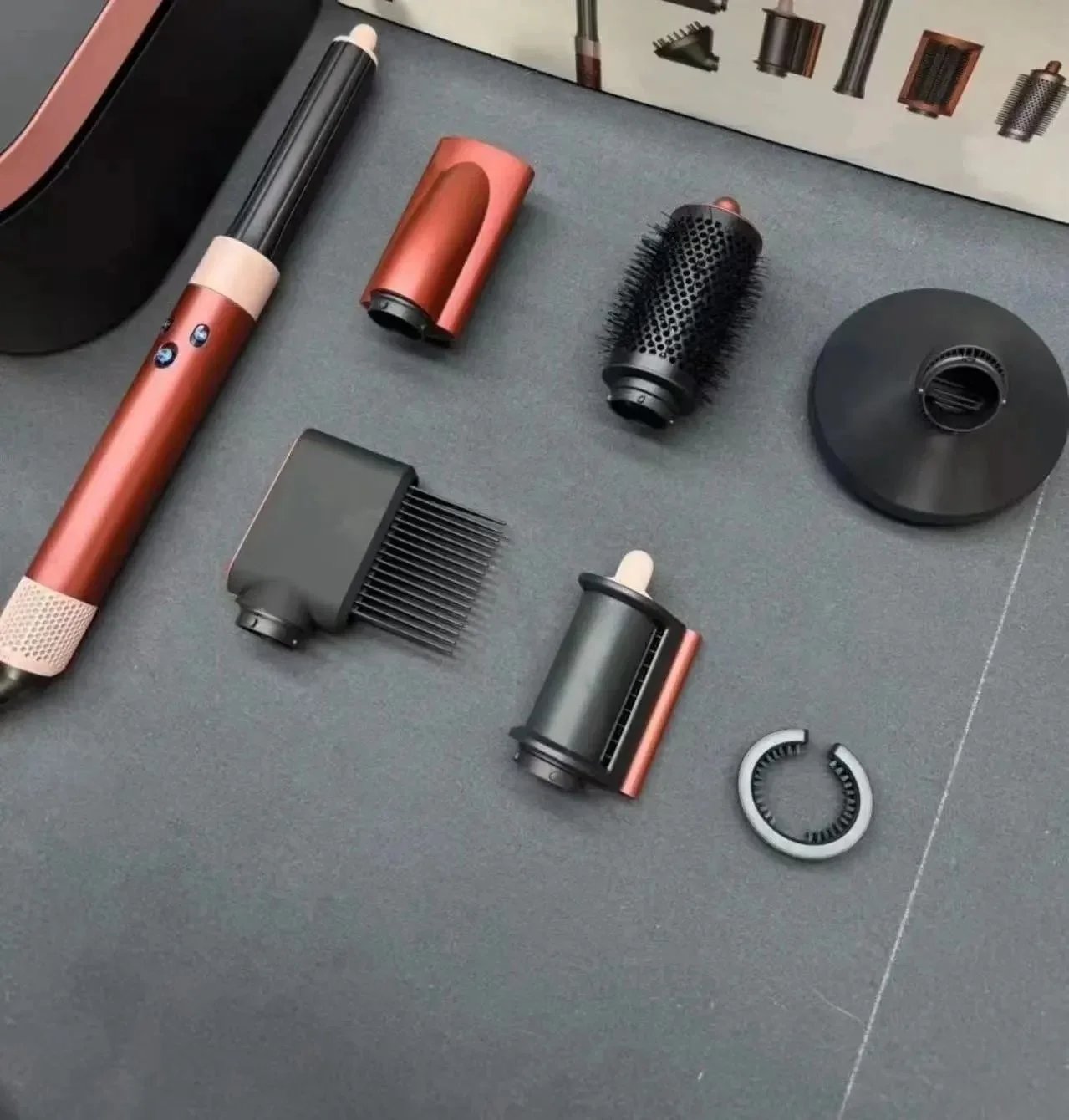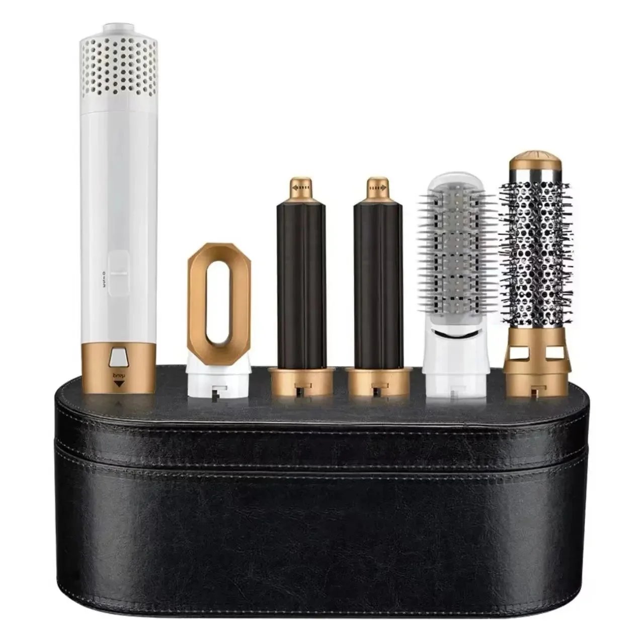 Complete multi-function hair styling kit featuring a versatile hair dryer, curling wand, straightener, and multiple attachments for sleek, curled, or voluminous styles at home.