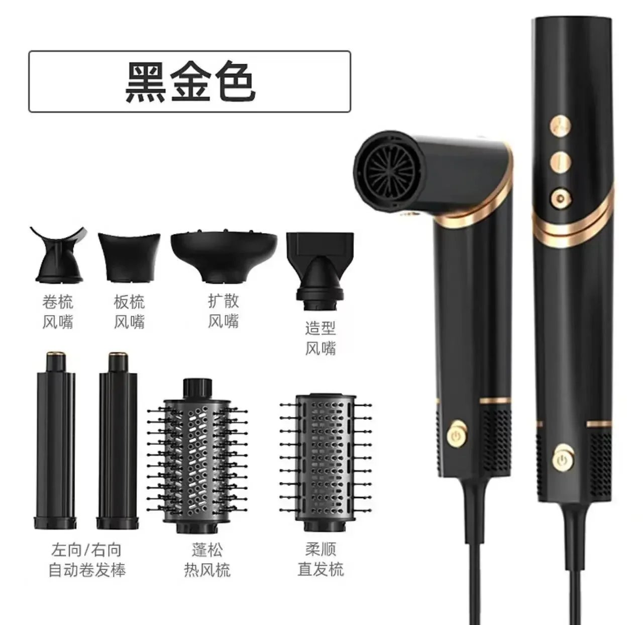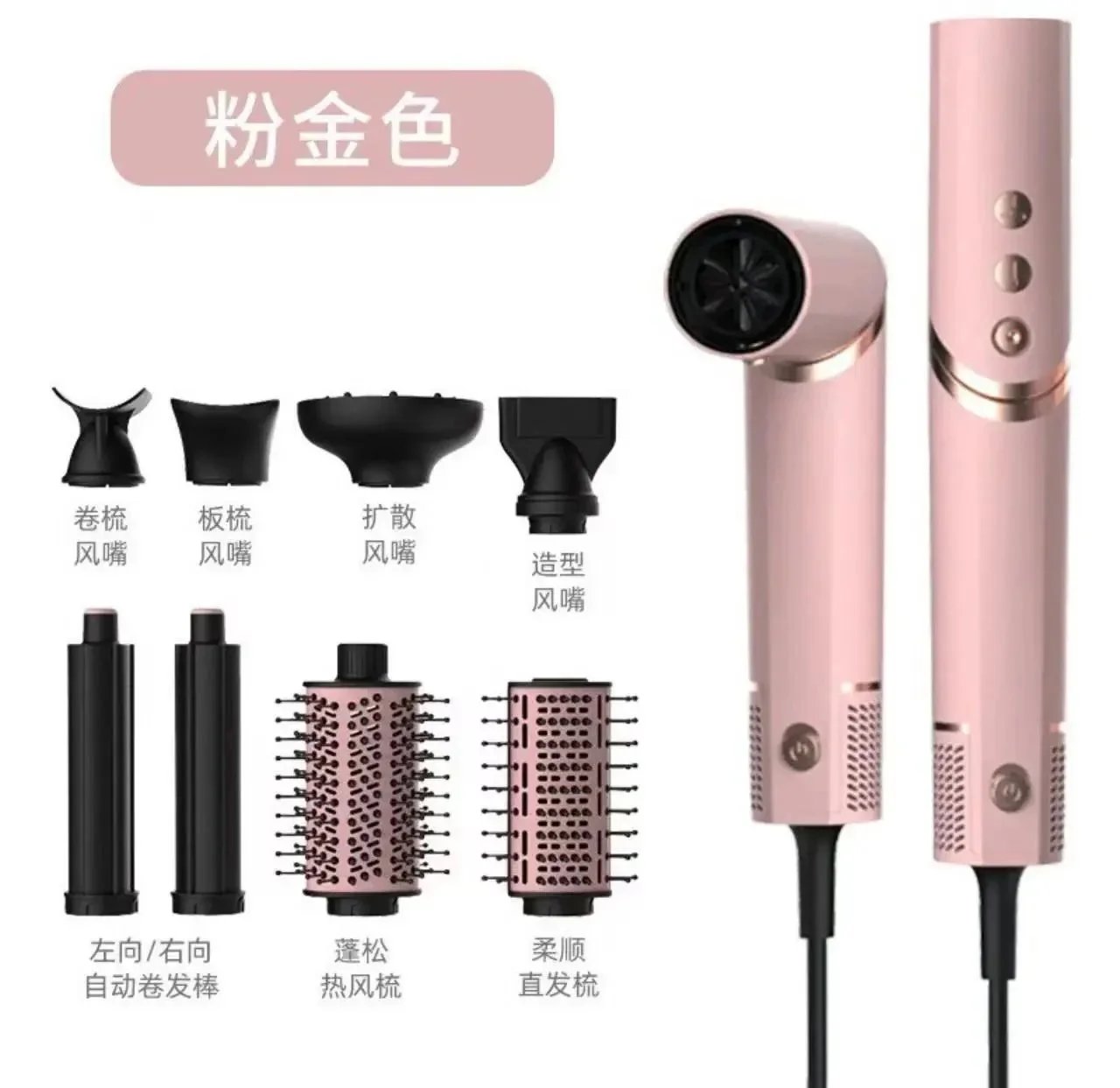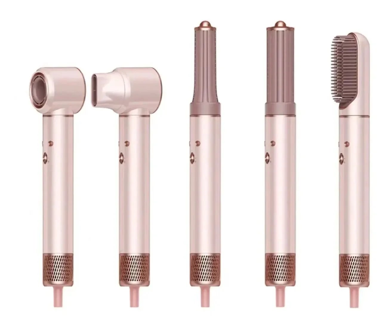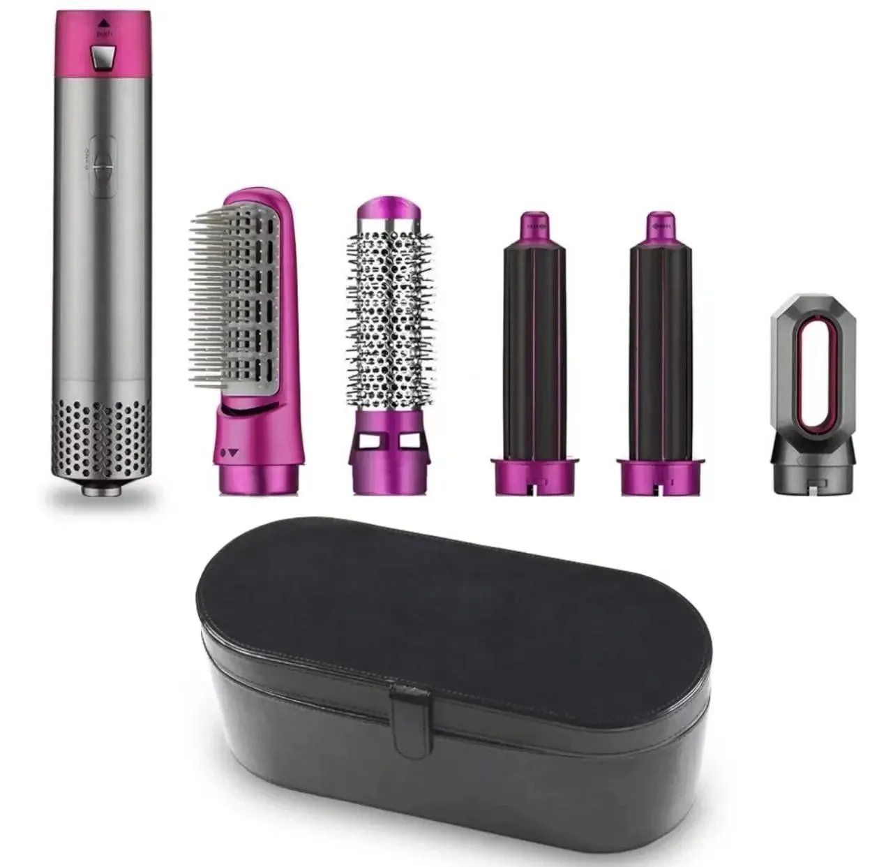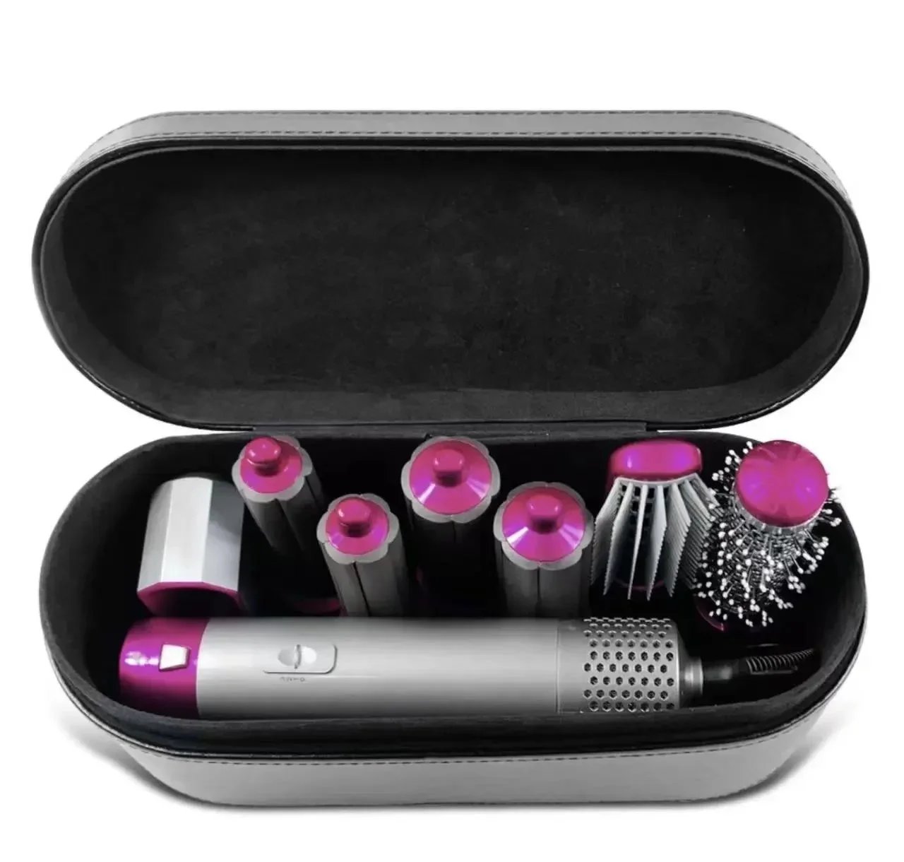 Complete multi-function hair styling kit featuring a versatile hair dryer, curling wand, straightener, and multiple attachments for sleek, curled, or voluminous styles at home.