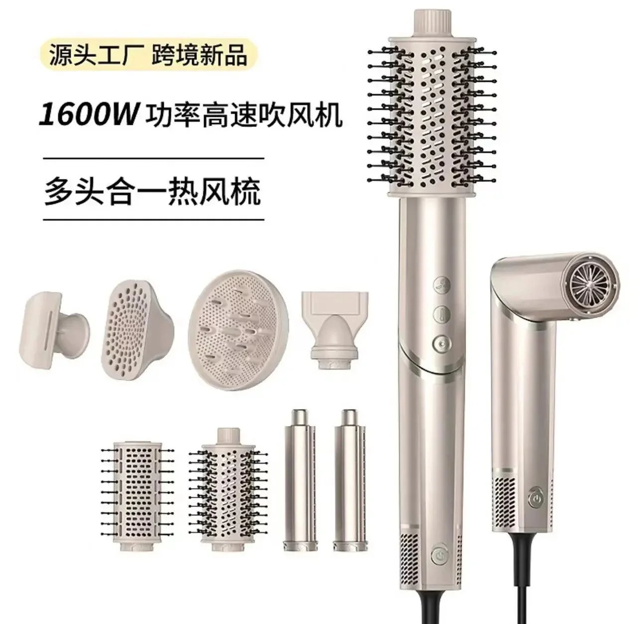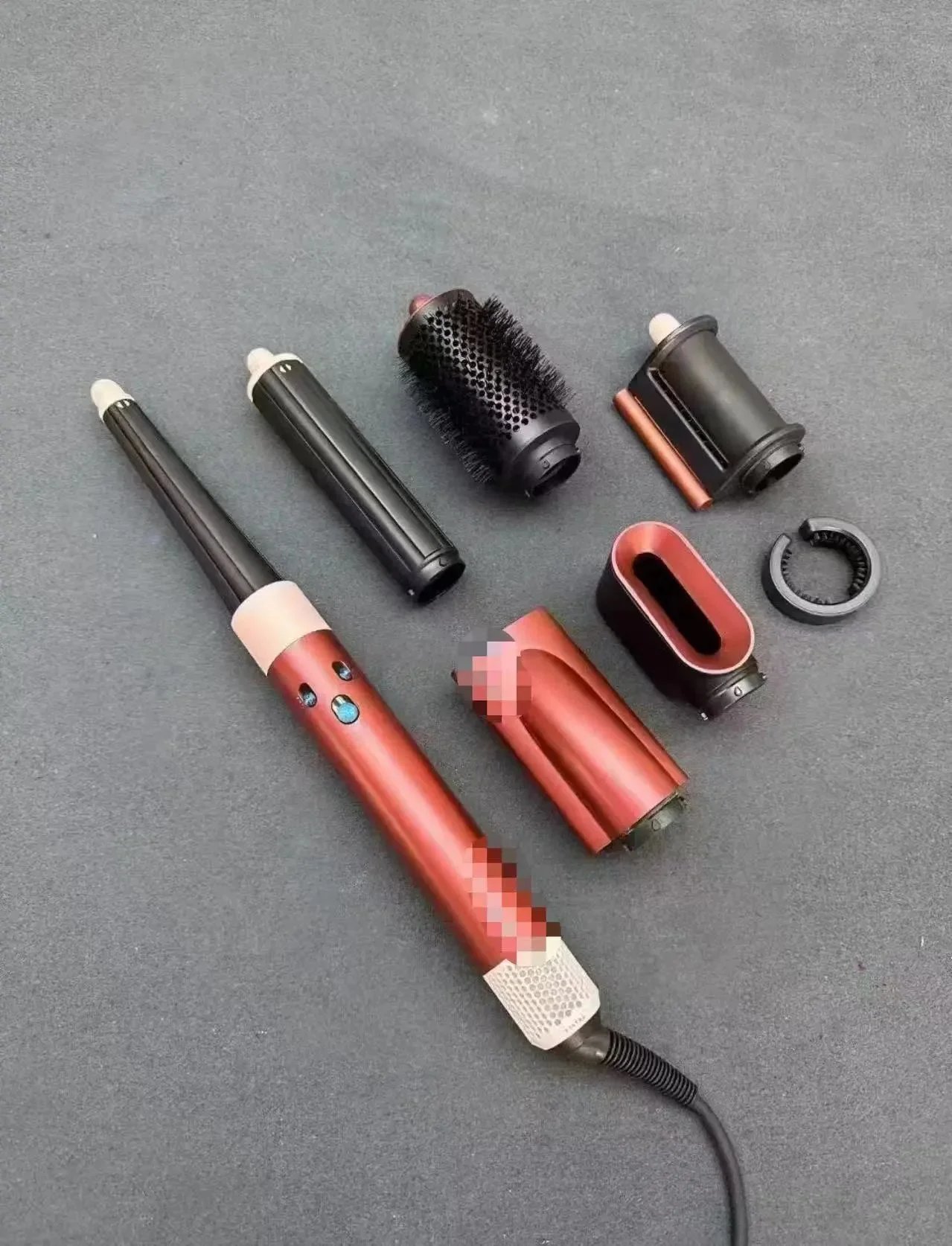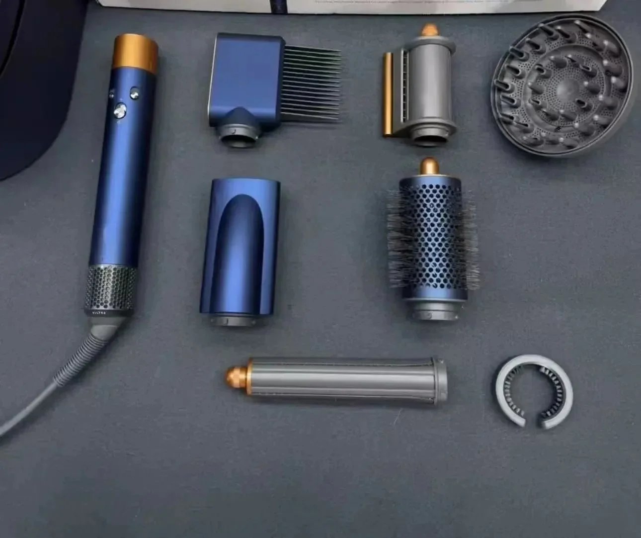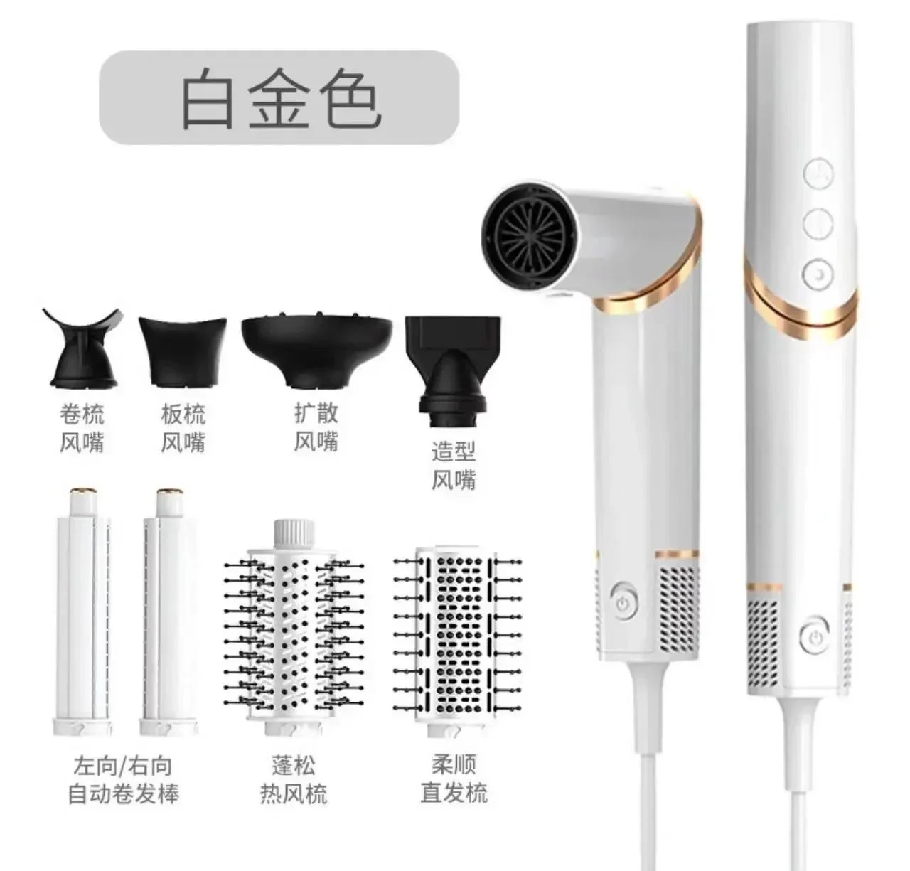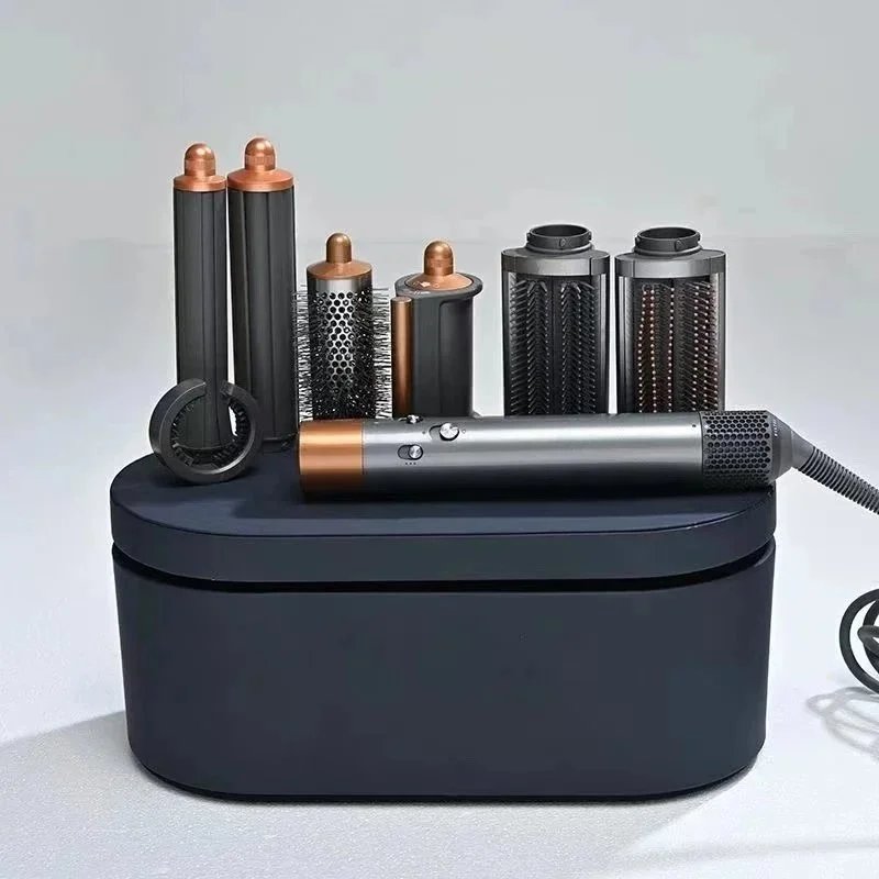 Complete multi-function hair styling kit featuring a versatile hair dryer, curling wand, straightener, and multiple attachments for sleek, curled, or voluminous styles at home.