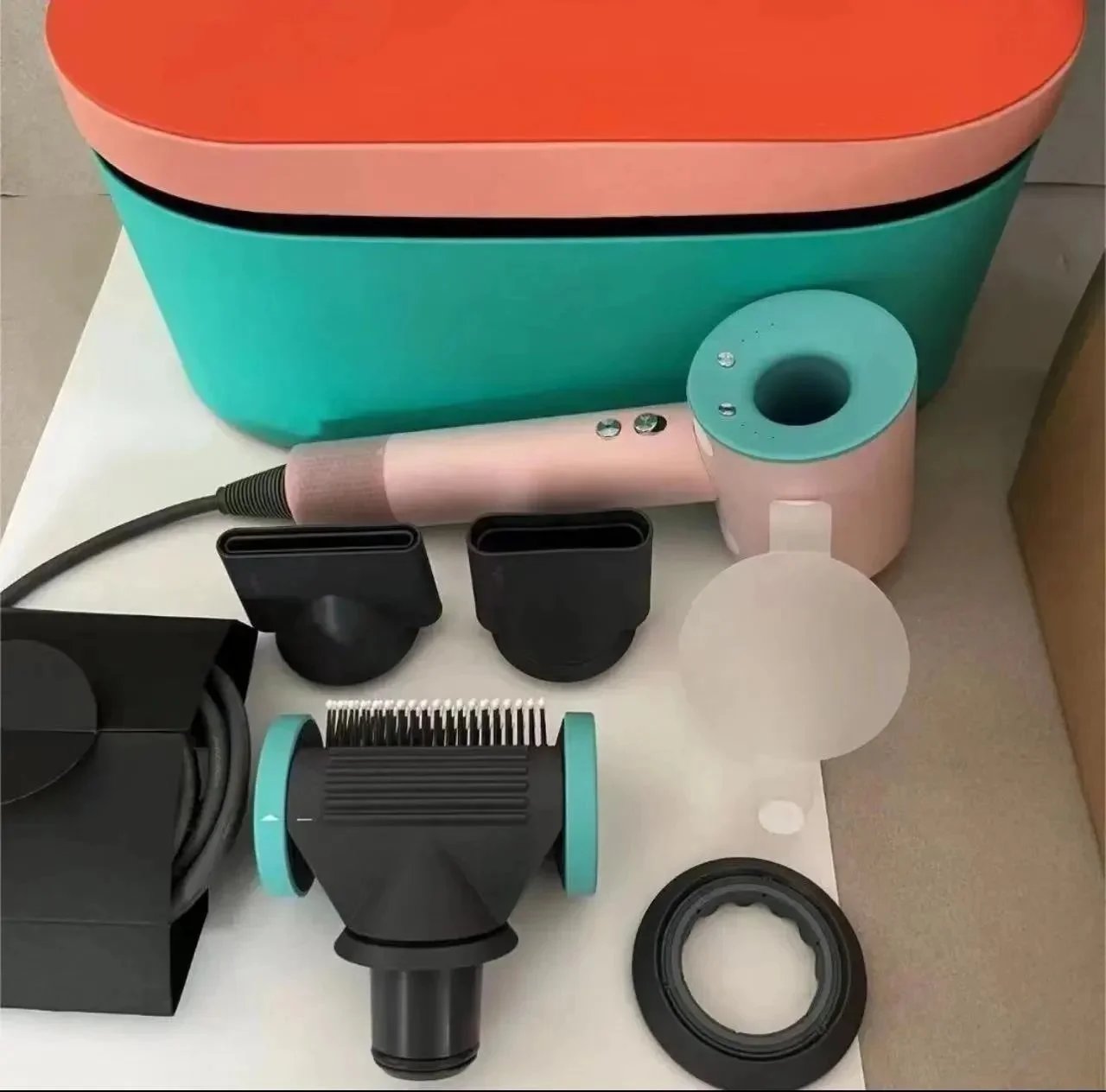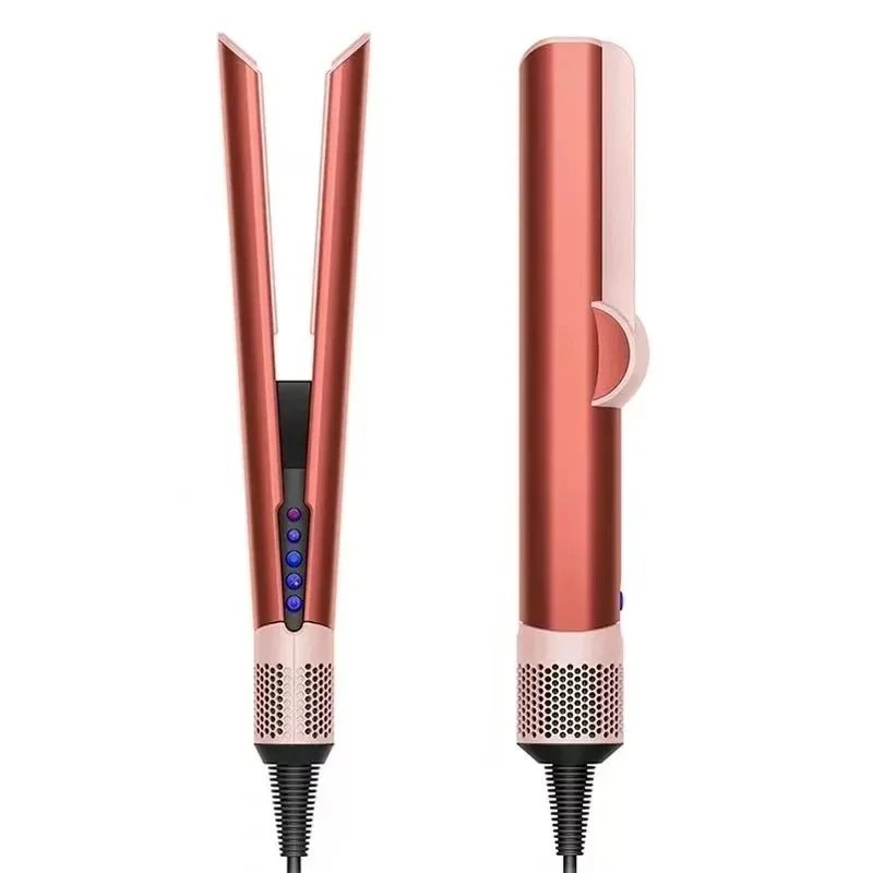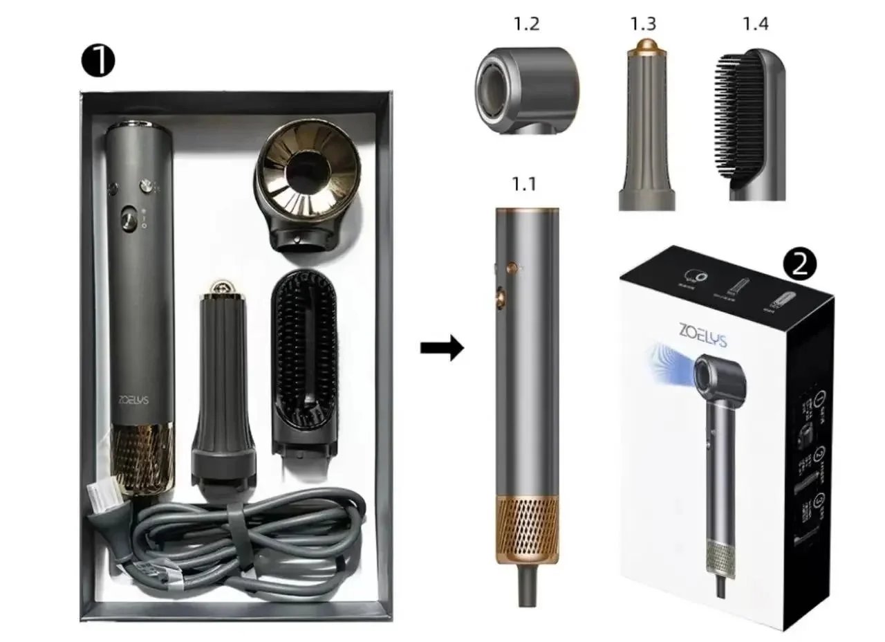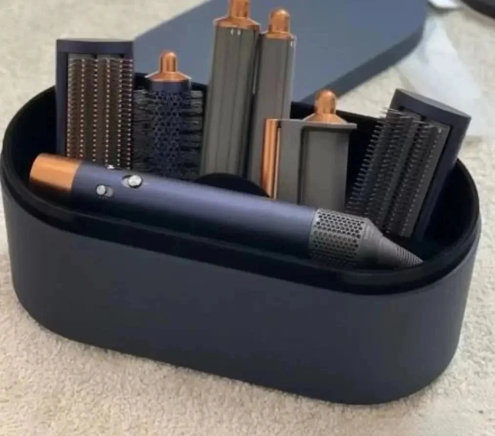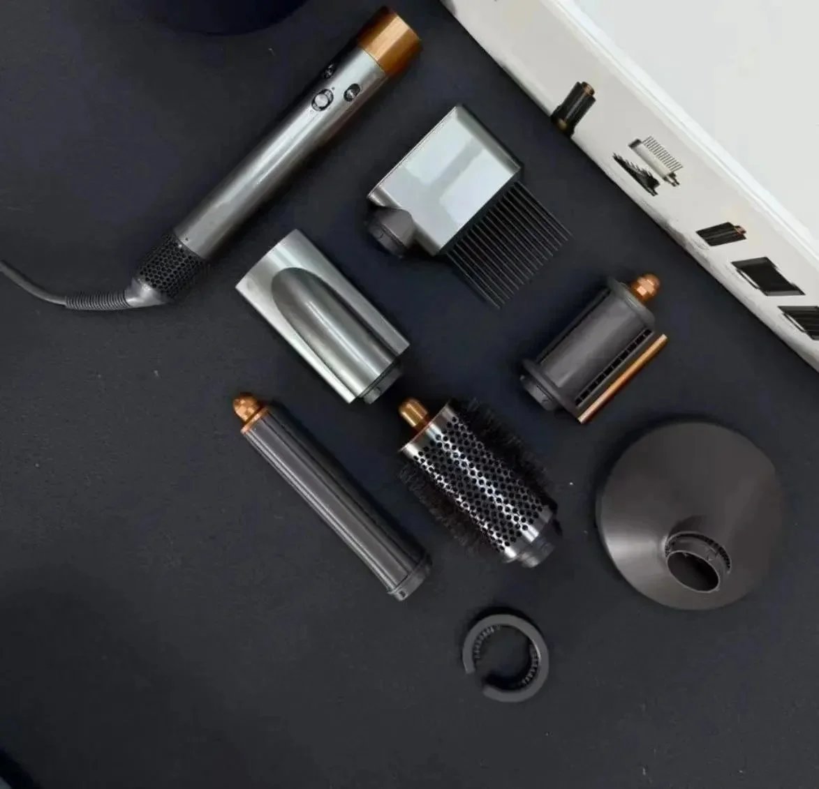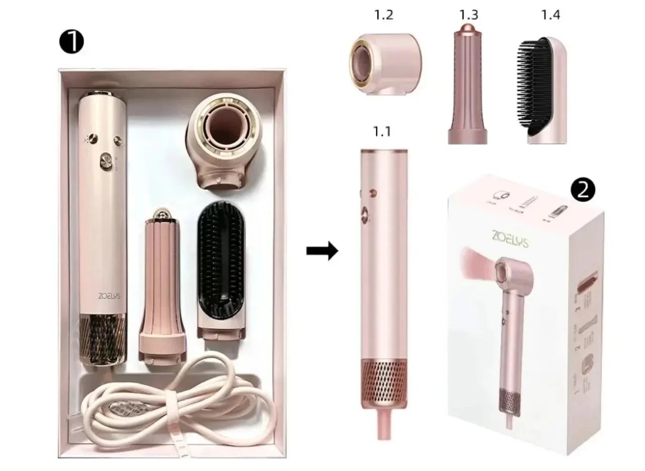 Complete multi-function hair styling kit featuring a versatile hair dryer, curling wand, straightener, and multiple attachments for sleek, curled, or voluminous styles at home.