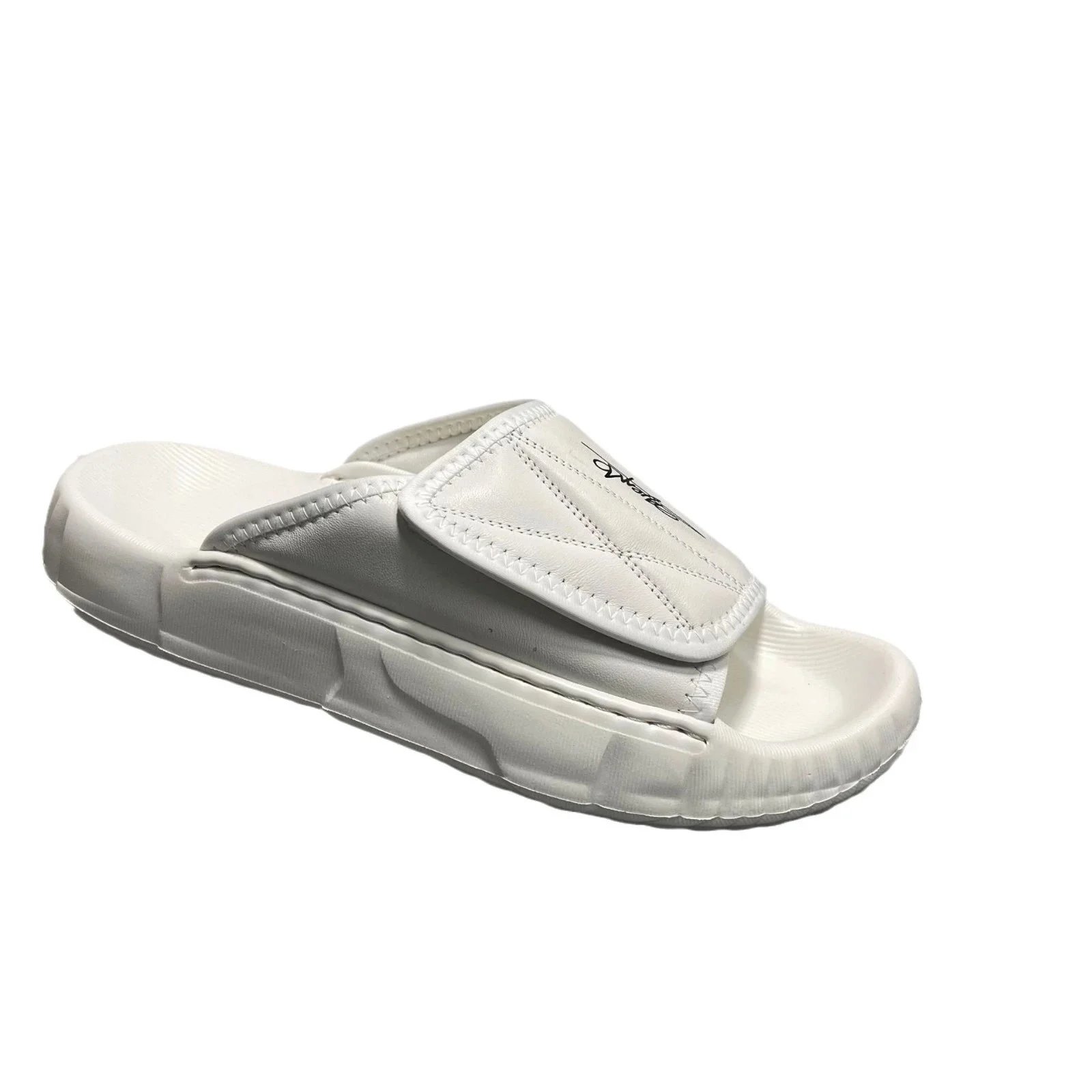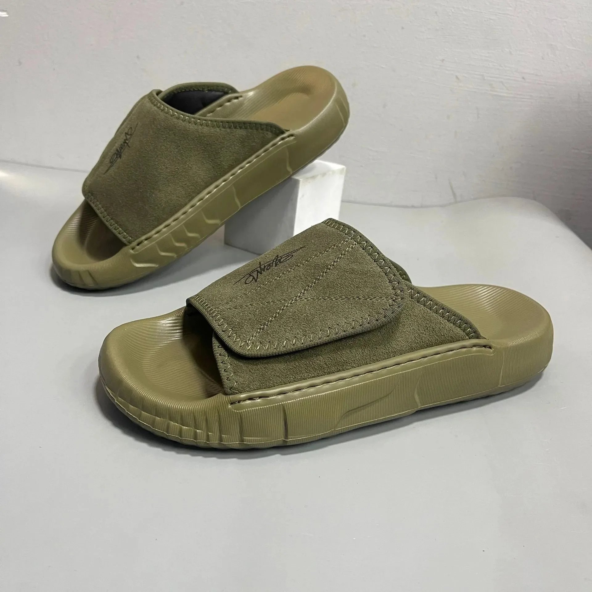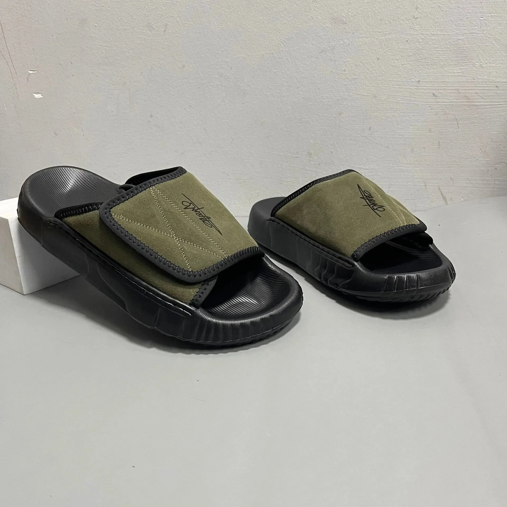 Comfortable olive green slide sandals featuring a quilted strap design and durable sole for everyday wear.