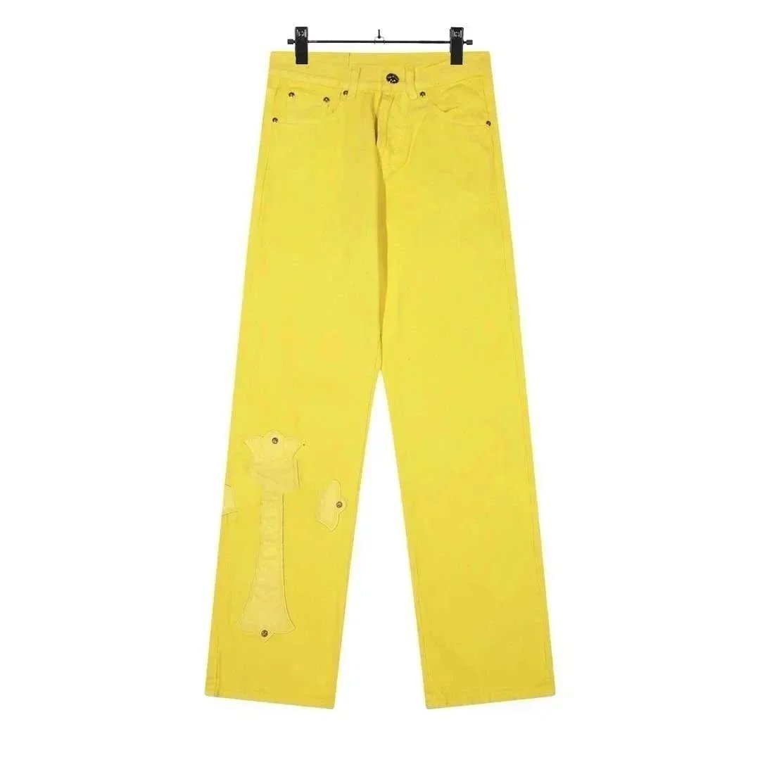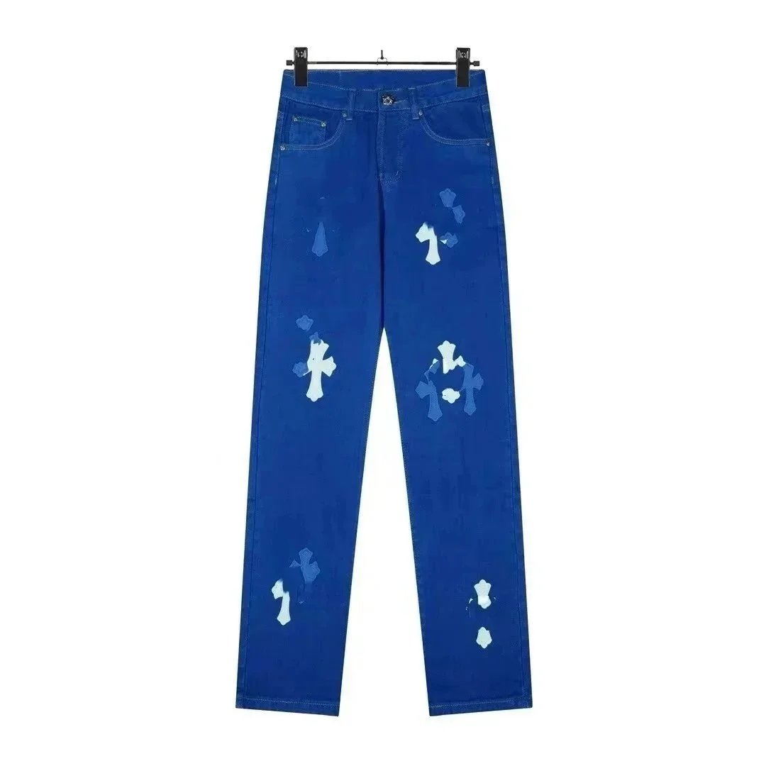 Stylish light blue wide-leg jeans featuring intricate patchwork and cross embroidery details for a bold, artistic look.
